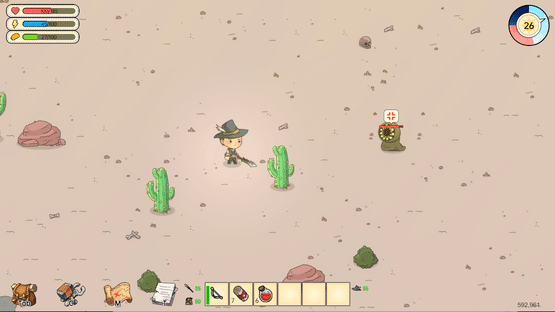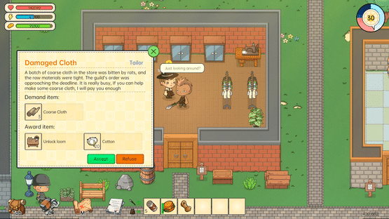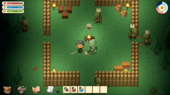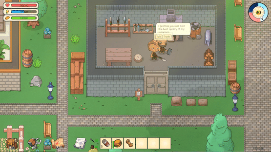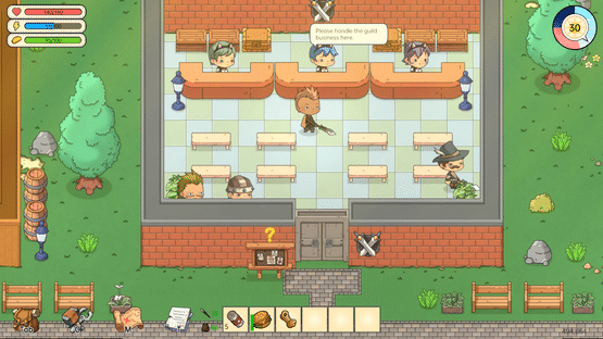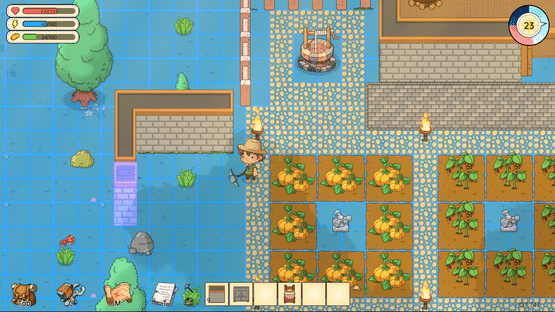 2D top down view open world sandbox survival farming game. Survive, adventure, hunt, gather resources, craft, build, farm, fish, trade, become an adventurer, complete various tasks and explore this fantasy world.