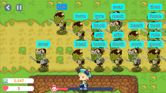Enemies will continue to appear from the right side of the screen. All enemies will have a word above their heads, and you need to use the keyboard to type the correct letter to kill them before they reach the edge of the screen.