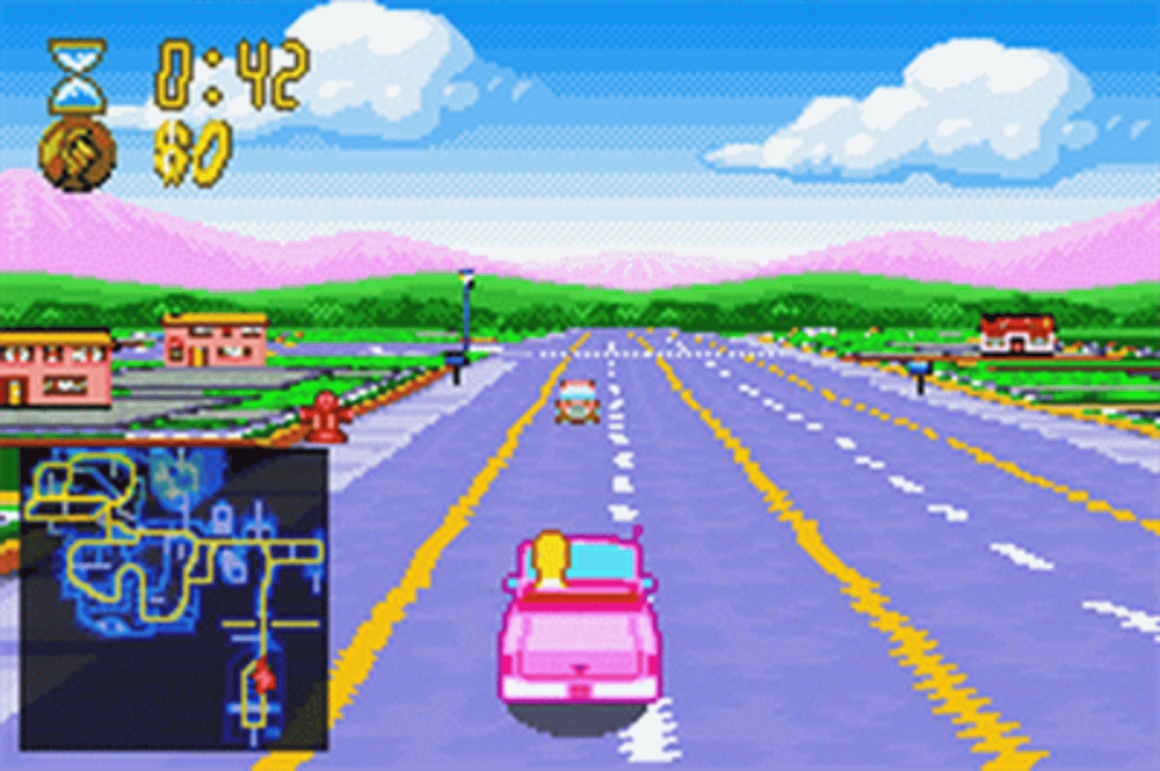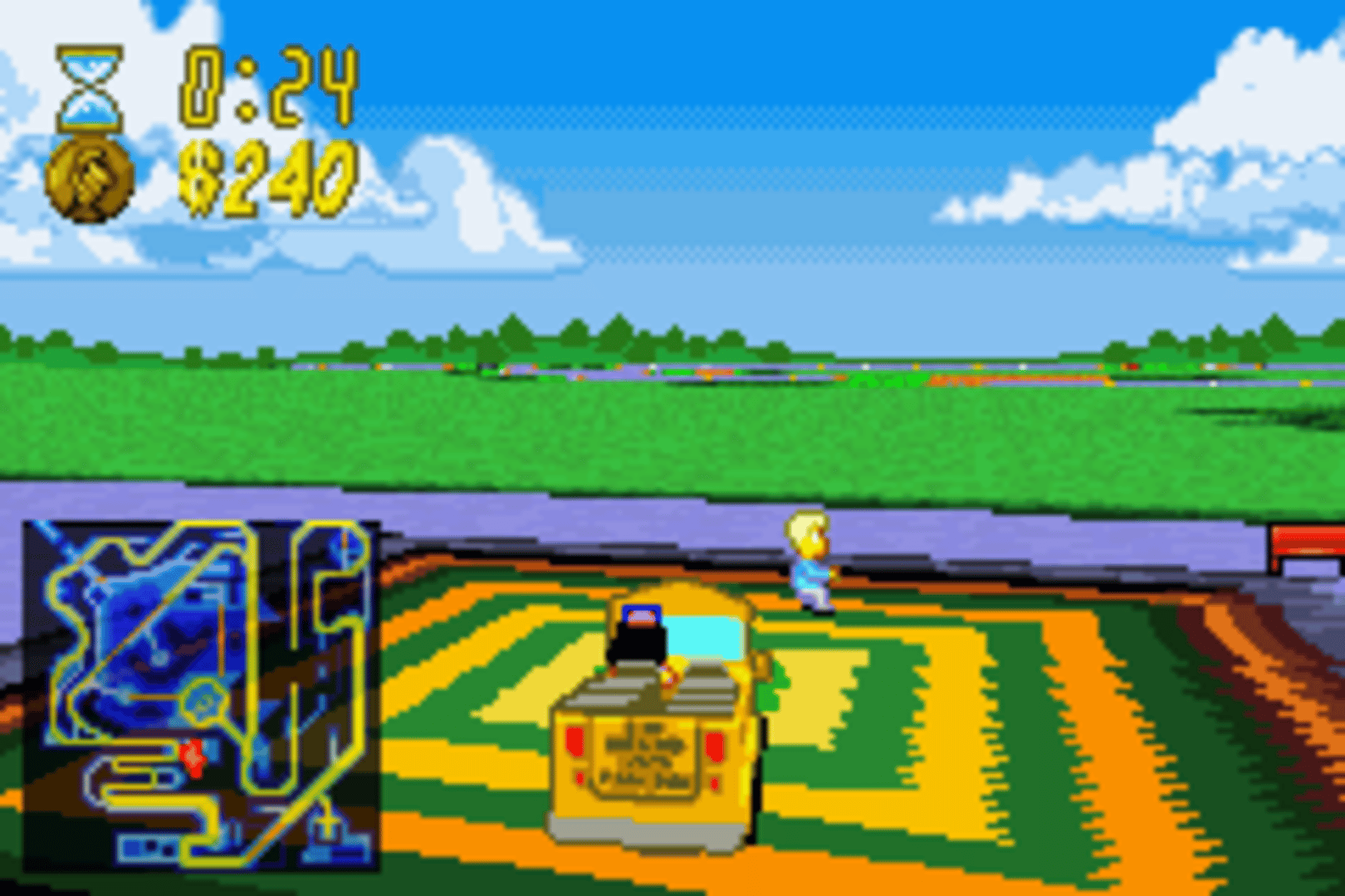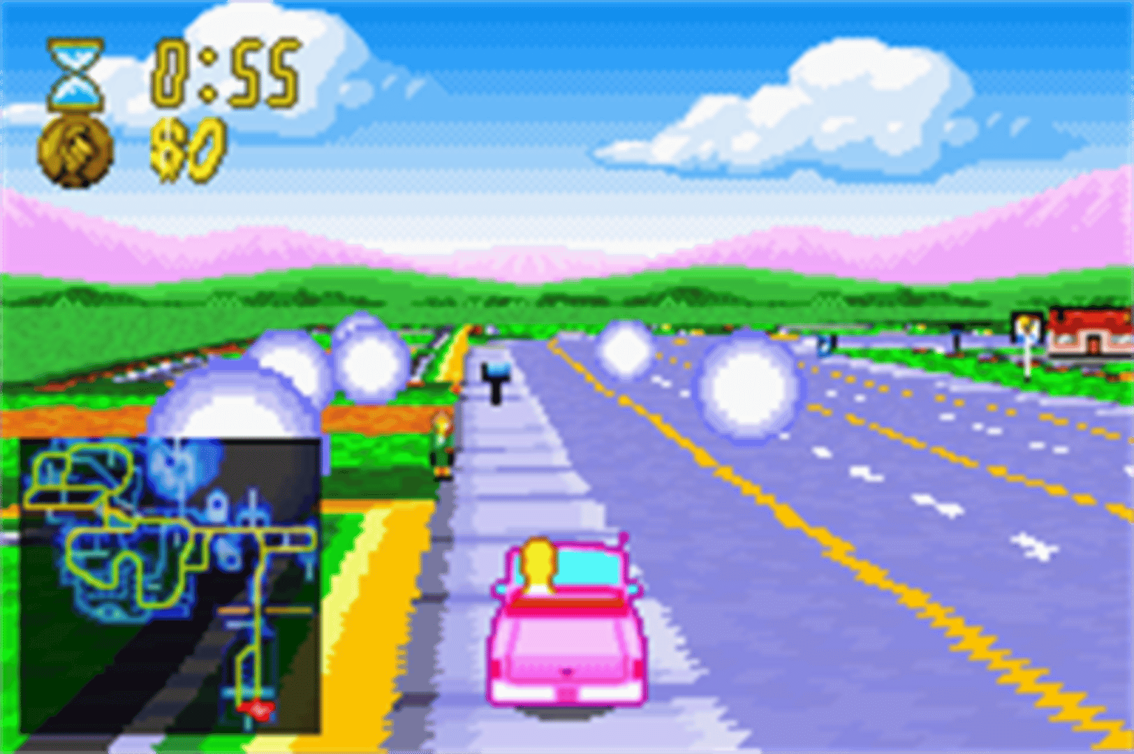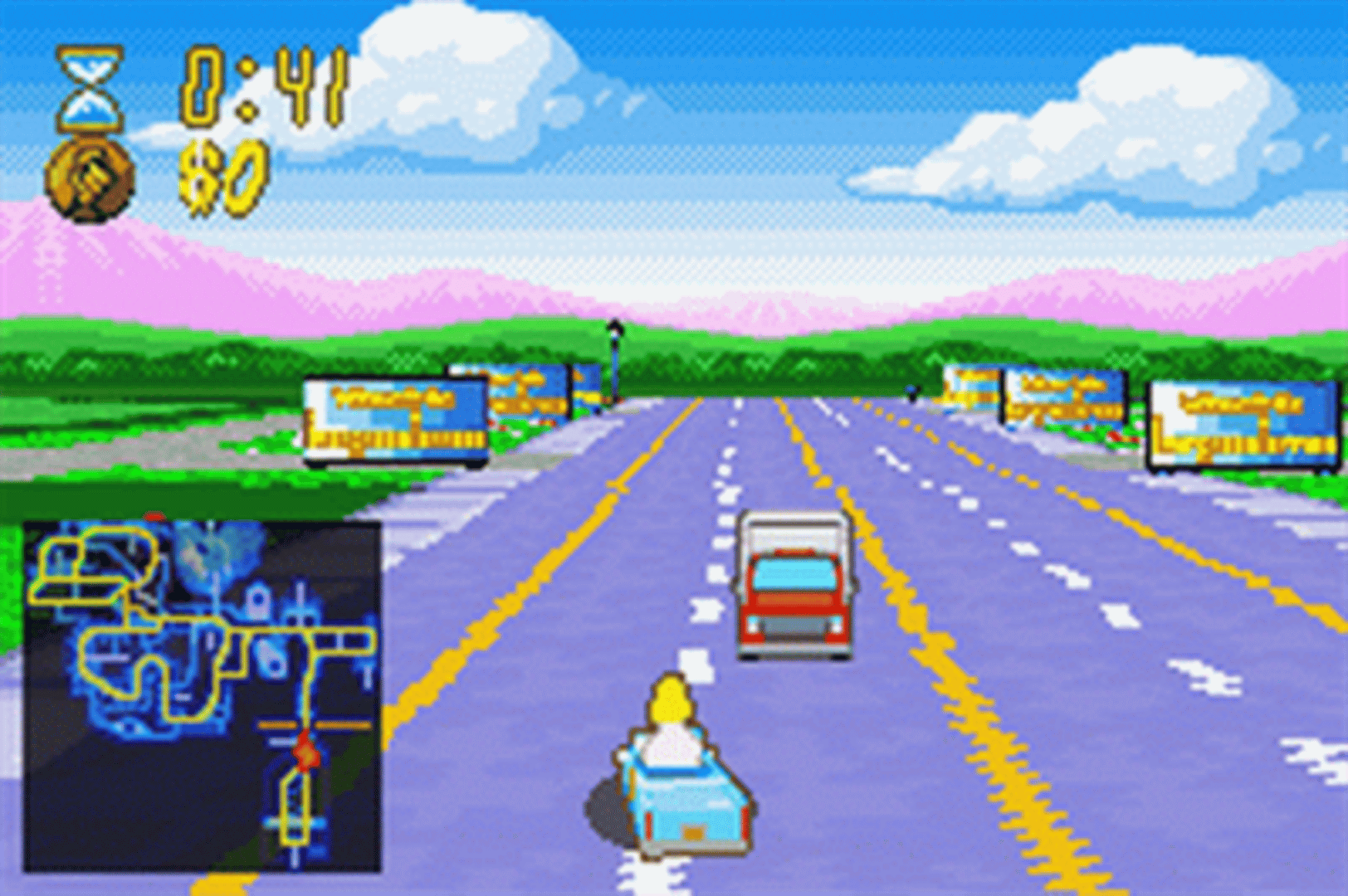 This is the Game Boy Advance version of The Simpsons: Road Rage that was first released in 2001 for PlayStation 2, Xbox and GameCube. The game is based on the animated television series The Simpsons, and is part of a series of games based on the show. The game stars Homer, Marge, Bart, and Lisa, as well as Mr. Burns and several other characters from the show. The Simpsons: Road Rage is similar to Sega's 1999 video game Crazy Taxi, in that the main objective is to drive picked up passengers to their destinations as quickly as possible. These similarities led to Sega suing Radical Entertainment and Electronic Arts for patent infringement though it was settled before going to court.