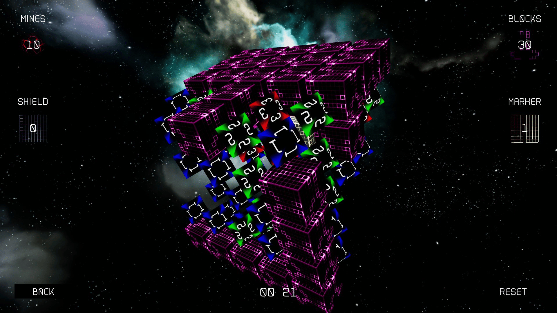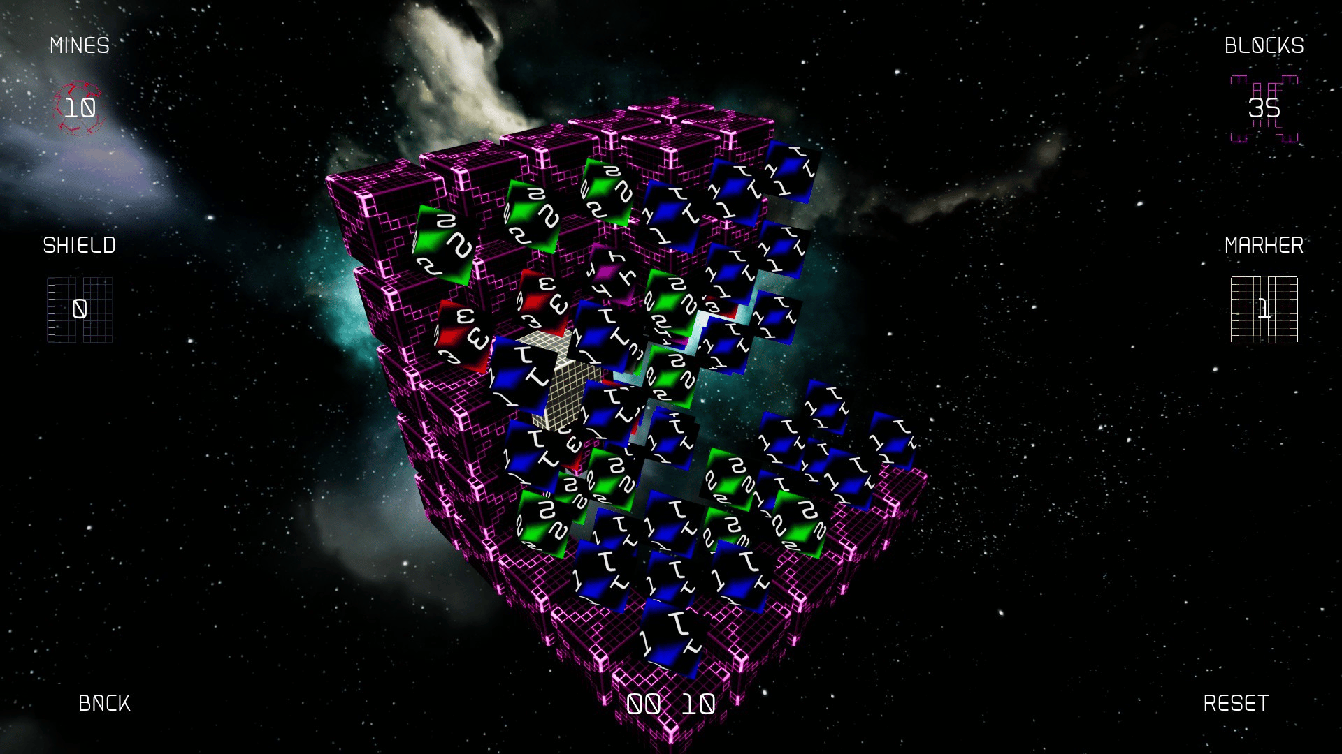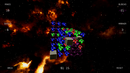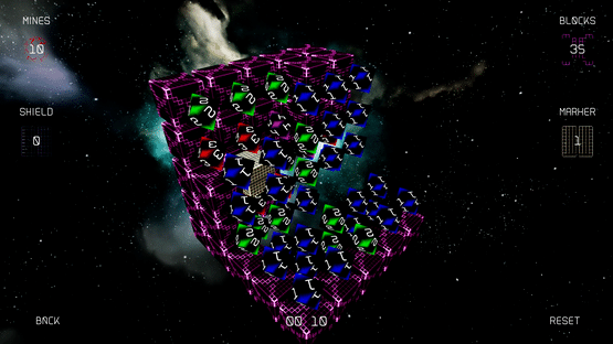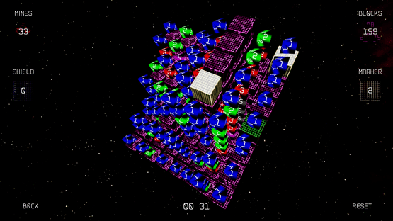 Mines are randomly distributed. Find where they are by removing blocks. Beacons will guide you by showing how many adjacent Mines there are, if any. You win when all Mines have either been surrounded or have been removed. Be careful not hit a Mine!