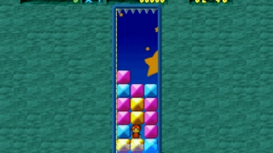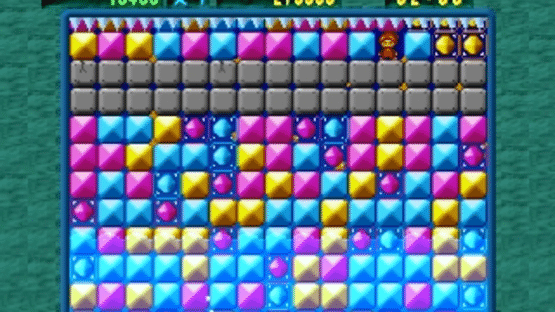 Destructo 2 is a simple color-matching puzzle game similar to Mr. Driller, originally released as part of a budget series in Japan. The main objective is to guide a cartoon character moving through an ascending pile of multicolored tiles, pushing the available blocks to create clusters of the same color. Groups of four or more tiles of matching colors can be removed by punching one of the connected blocks, with the vacant space being occupied by the falling stacks on top. The descending tiles that end up rearranged in new color clusters are automatically eliminated and give combo points.