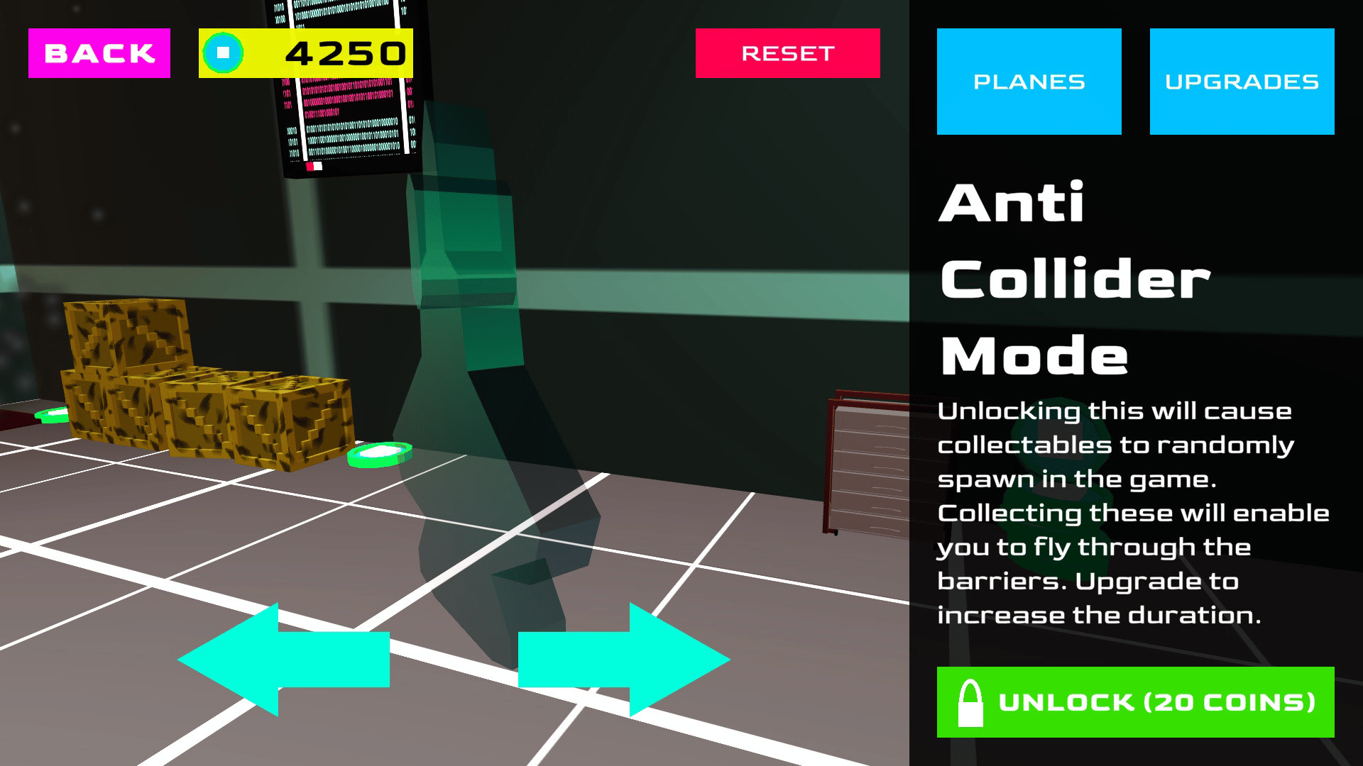 You're controlling a plane that is going forward in an infinite and randomized space filled with barriers. Use your reflexes to dodge the incoming barriers in high speed. Collect coins along the way to later spend them in the store section.