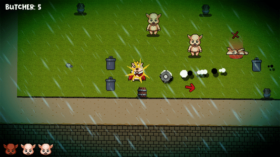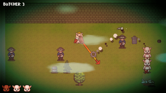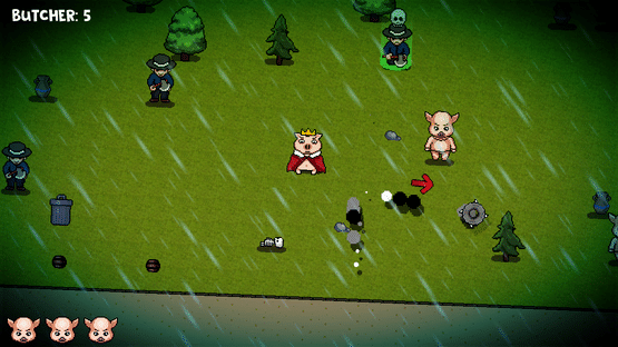 "King Pig" is an old-school top down arcade game. Your main goal is to save pigs from butchers. Be careful, butchers` saws must not hurt the pigs - dodge the saw with your heavy-duty cloak and kill all butchers!