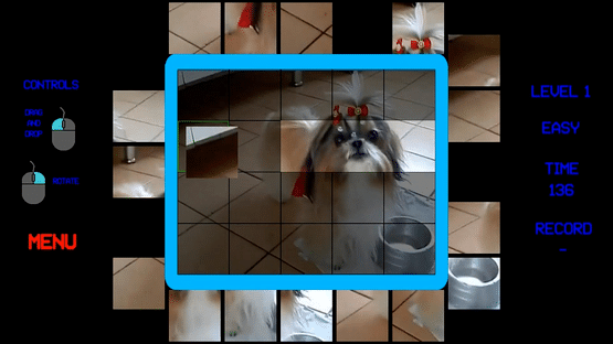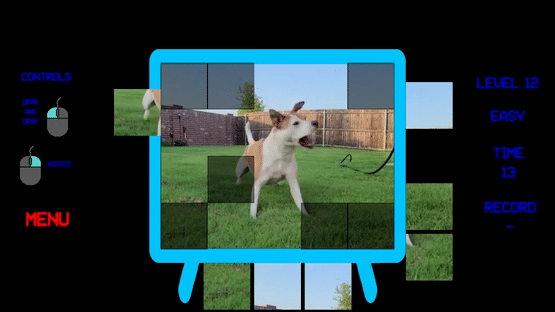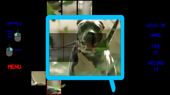 A jigsaw puzzle with videos of dogs in a cyberpunk atmosphere. Beat the clock and find out what Kitty's message is.