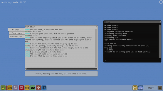 A narrative driven hacking game that takes you on a journey around murky hacking circles. You will be using the console and graphical tools to hack systems in order to profit and advance the storyline.