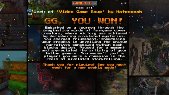 Gamedle is a game made for gamers, created by a single developer. Inspired by Wordle, Framed and the other spinoffs. Guess the videogame by its cover, every day a new game. You can also try the Unlimited mode to play non-stop.