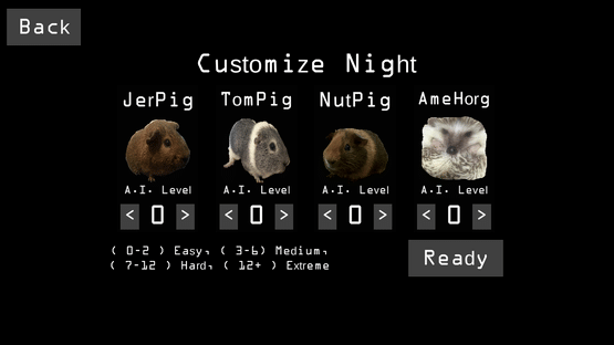 A Five Nights at Freddy's fangame featuring 3 guinea pigs and one hedgehog ( Note: not Sonic the Hedgehog. ). Complete with a custom night and star system.