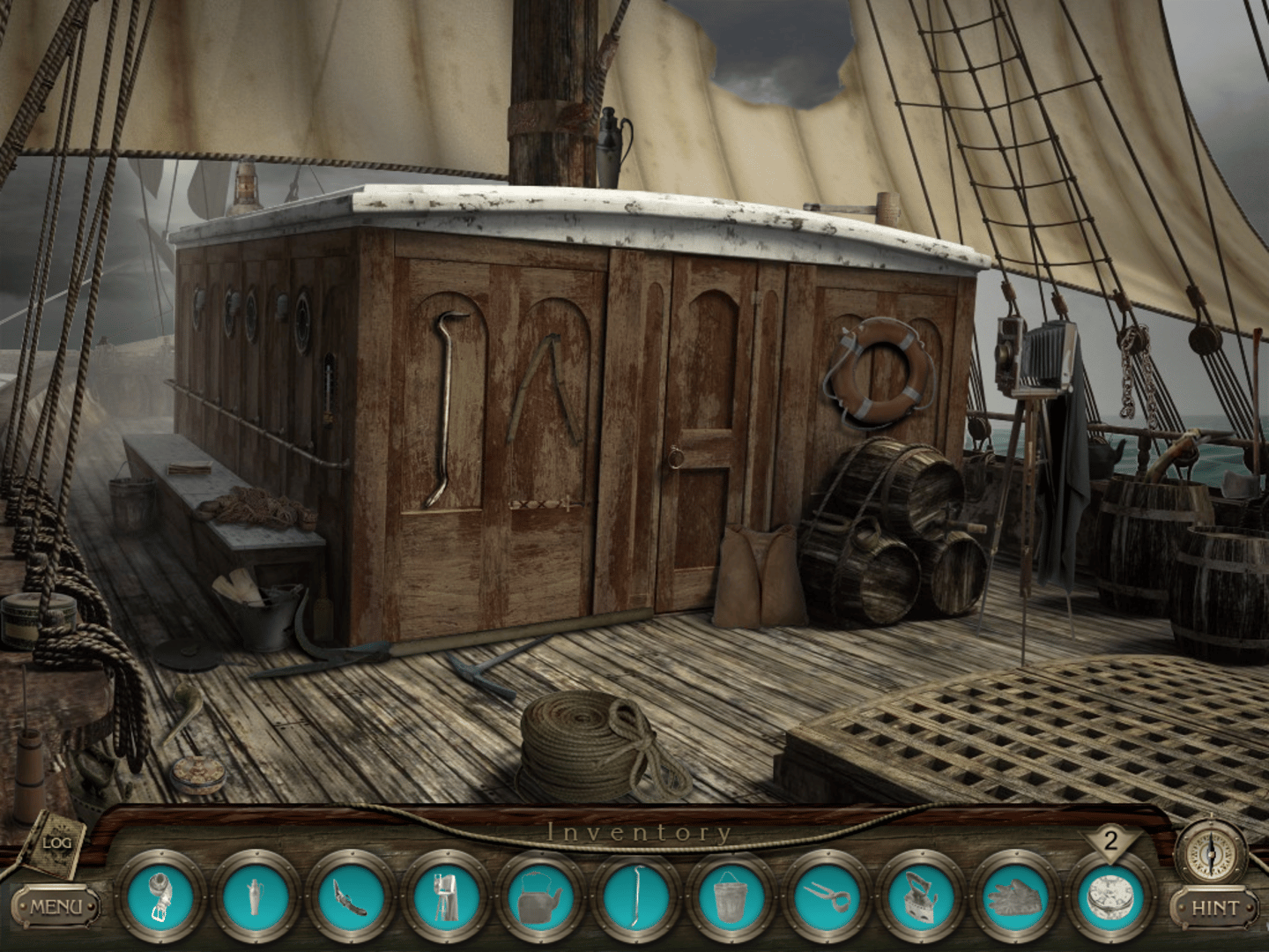 The Mystery of the Mary Celeste is a hidden object game with adventure elements. The objective is to collect all the items shown at the bottom, as a series of black-and-white images on porthole windows, and use them to solve puzzles. Some portions of the scenery bring up a close-up window showing another angle of the scene, usually containing some of the required objects. Clicking on certain objects and characters opens up a number of connected containers around them, and the player has to drag and drop the collected tools from the inventory portholes to these blue circles, to complete the scene and move to the next one. Mini-games usually appear at the end of each chapter, presenting various challenges and puzzles. A pipeline has to be reassembled with scattered pieces, lengths of rope must be untangled by dragging a series of pulleys, wires have to be connected to complete a circuit, red pins have to be fixed to a nautical map following a list of coordinates and a radio has to be tuned to the correct sound waves. The games can be skipped at any time.