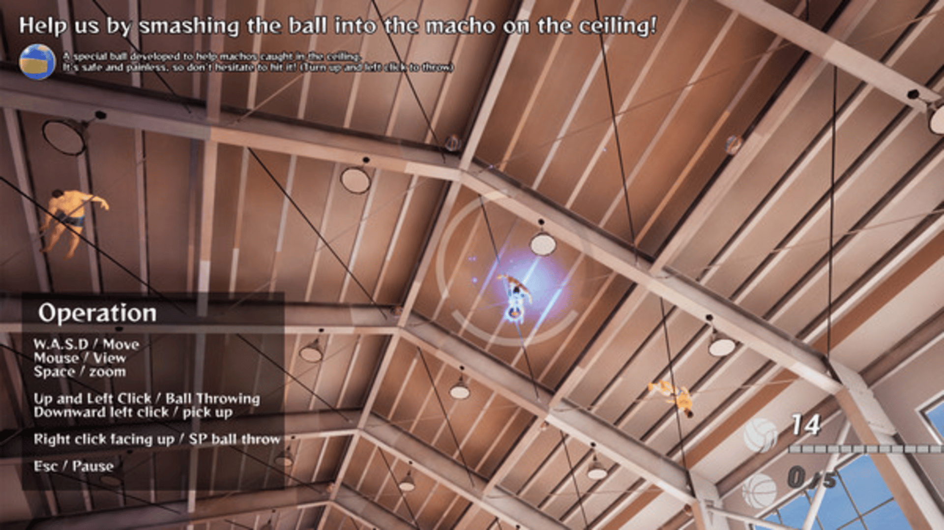 This is a new type of shooting game in which the player rescues muscular trapped in the ceiling of a gymnasium by hitting them with a ball.