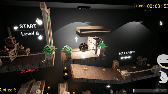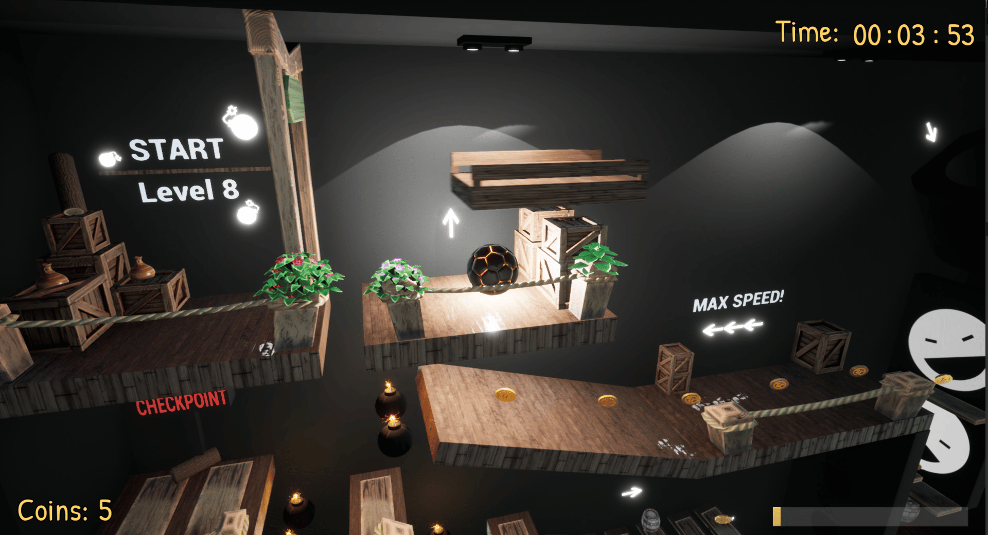 PlatformRoll is a game with challenging obstacles including bombs, guns and gaps through platforms. Maneuver the ball across all the platforms in the dark with only a little light in order to reach the next level. Compete against an online leaderboard and see how fast you can complete each level.