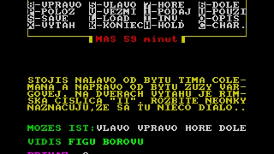 Slovak text adventure game, likely the first Czechoslovak homebrew title to feature autobiographical elements within the game's narrative. Title and characters are an homage to Fuxoft. Takes place in a Czechoslovak apartment building, with gameplay based on map navigation and puzzle-solving against a time limit, controlled by keyboard shortcuts rather than typed-in commands. Received an English translation in 2021 as part of an initiative by the Slovak Game Developers Association in cooperation with Slovak Design Museum, with funding by the Slovak Arts Council.