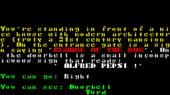 Slovak text adventure game wherein the player tries to break into a house to steal a secret recipe for Pepsi Cola. Music is taken from Trantor: The Last Stormtrooper. Received an English translation in 2021 as part of an initiative by the Slovak Game Developers Association in cooperation with Slovak Design Museum, with funding by the Slovak Arts Council.