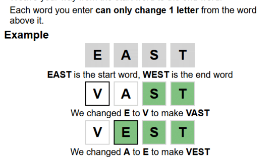 A daily word game, based on Lewis Carroll's word ladder. Players must change one word into another valid word, one letter at a time, until they have made the target word.