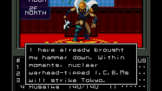 The story follows a nameless protagonist who lives in near-future Tokyo. When a portal to the realm of demons is opened, United States officials order a nuclear attack on Tokyo. Transported with two other supporting characters thirty years into the future, the protagonist finds the Earth ruined by a demon invasion, which is now the stage for an escalating conflict between the Order of Messiah and the Ring of Gaea, conflicting cults who wish to bring about kingdoms for their respective patron deities (YHVH and Lucifer). The story is influenced by moral decisions the protagonist makes, aligning him either with the Order, the Ring of Gaea, or setting him up as an independent agent. The gameplay uses first-person navigation of dungeons and turn-based battles against demons. The player can recruit demons as allies by talking to them rather than fighting them, and two to three demons can be fused to create new demons.