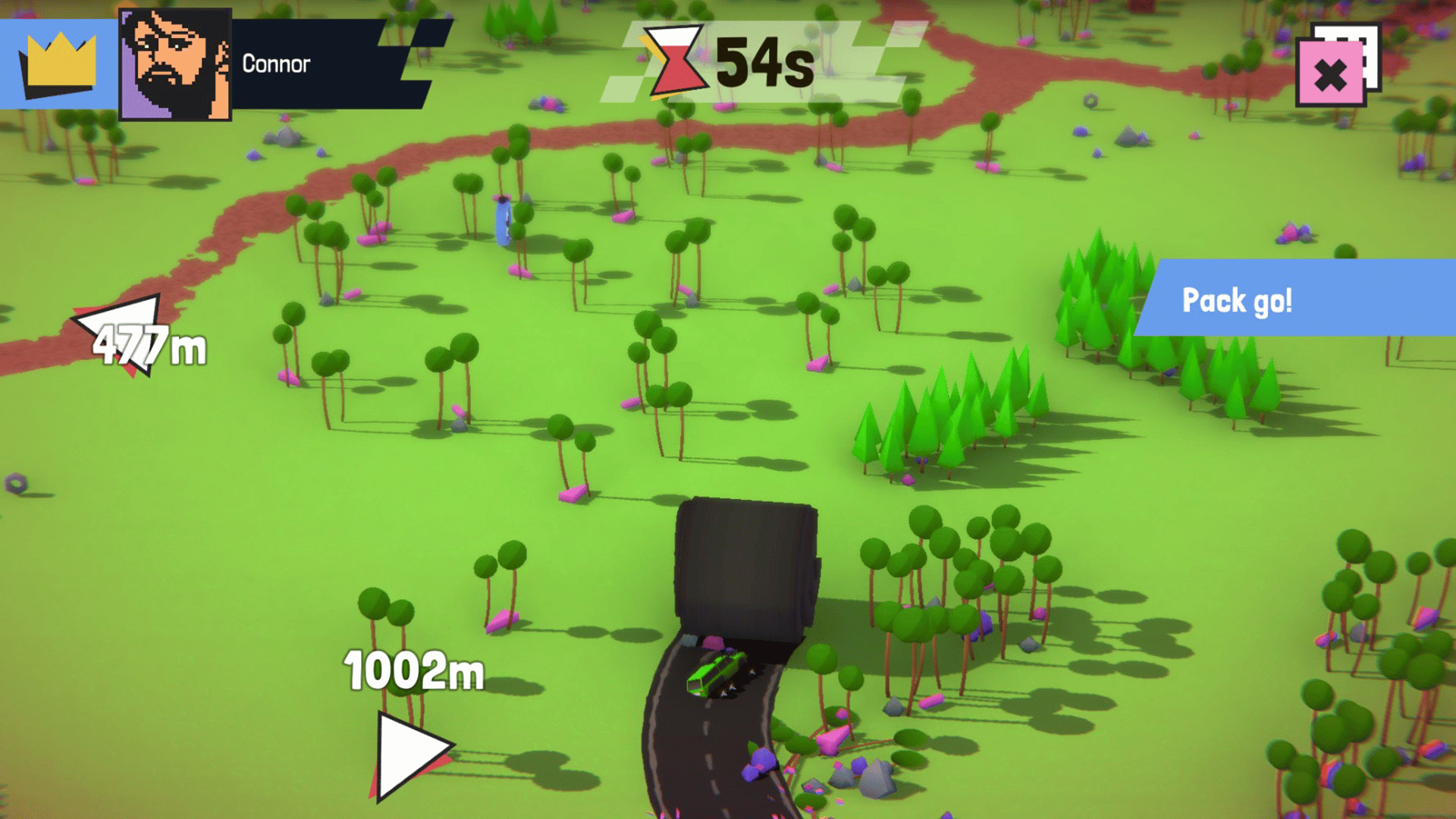 Rallyallyally is a multiplayer, last-man-standing racing game. Each round one player makes a new track that the others must follow. Slow players are eliminated until only one remains. It's fun, bold and exciting.