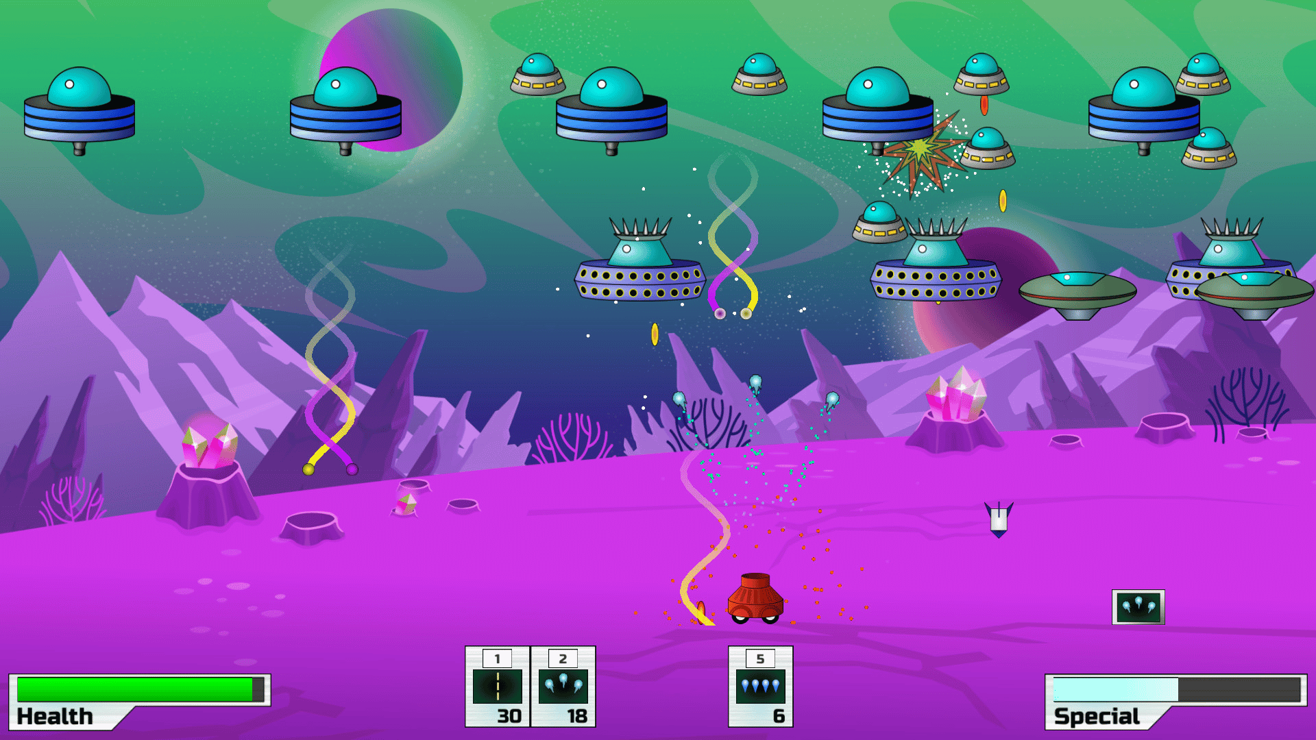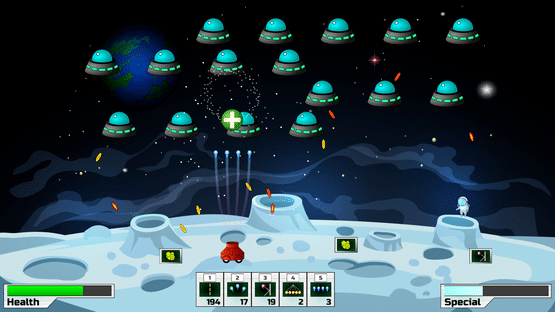 Destroy waves of UFOs in a arcade style space shooter with an array of powerful weaponry.