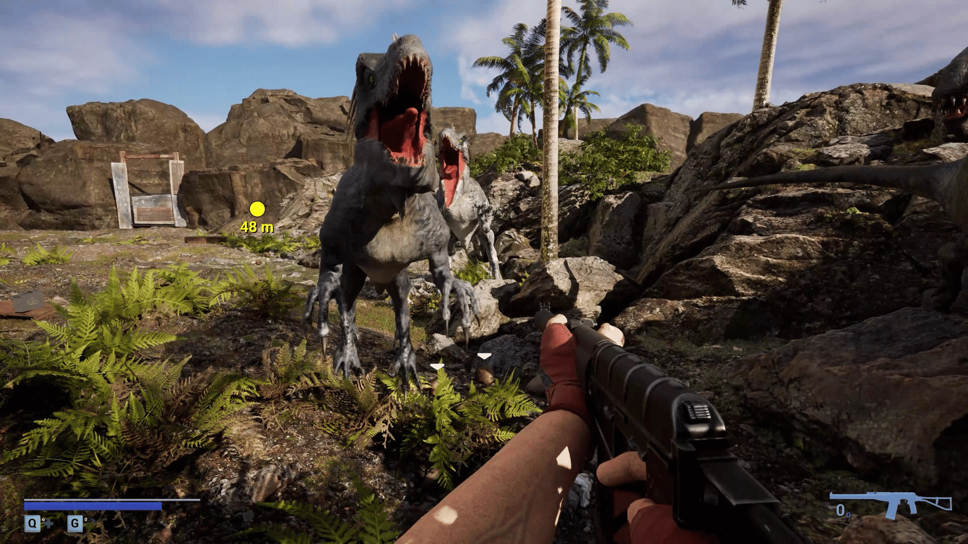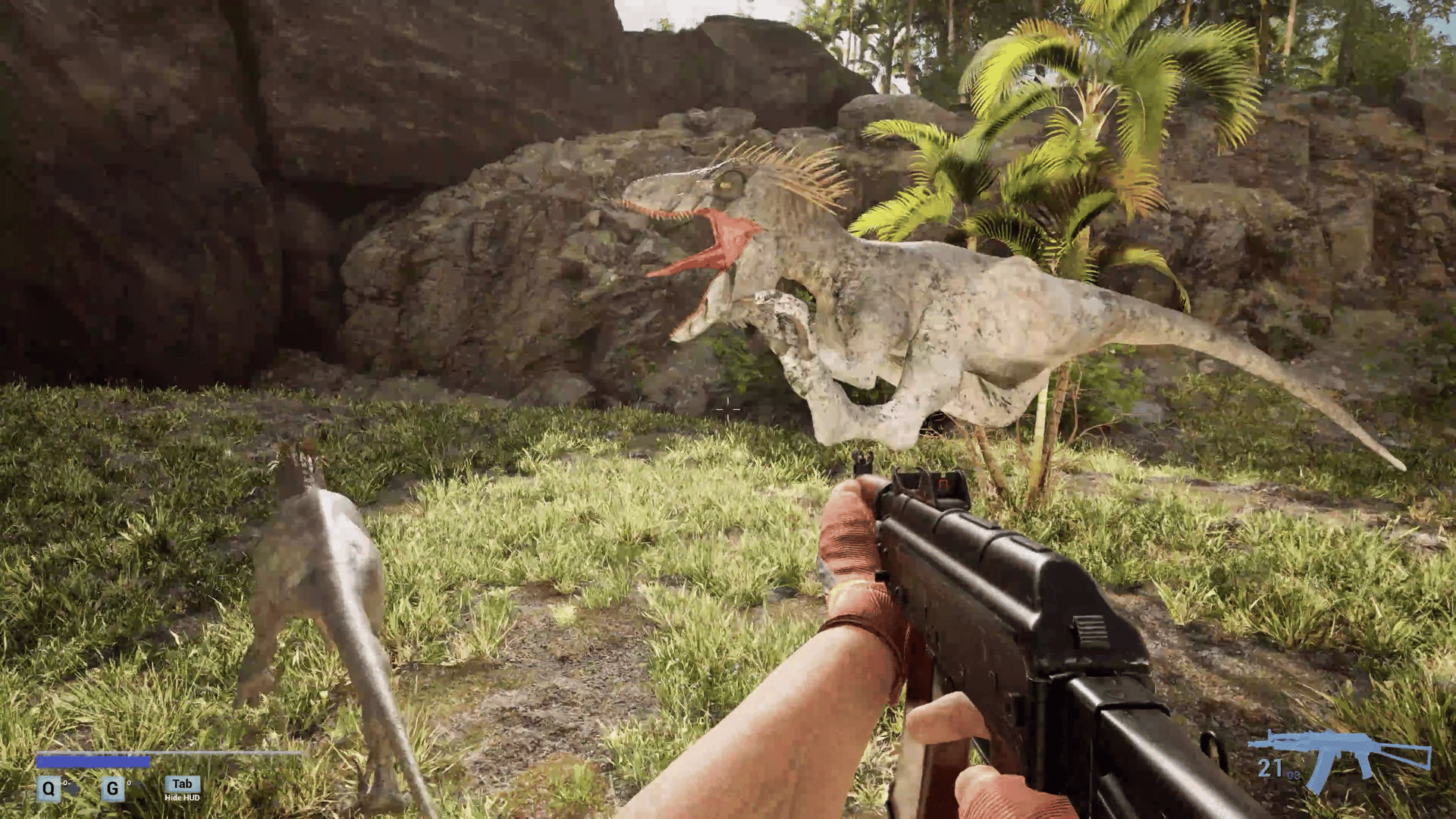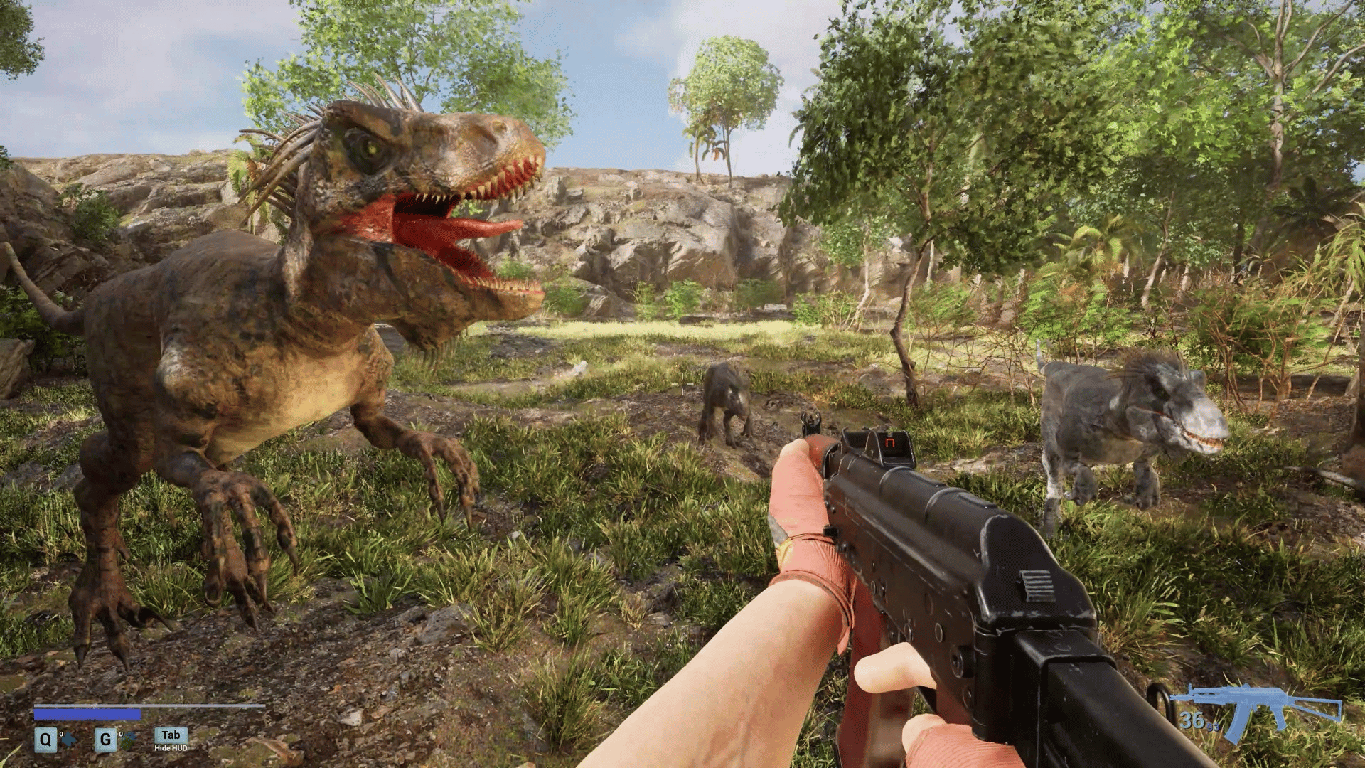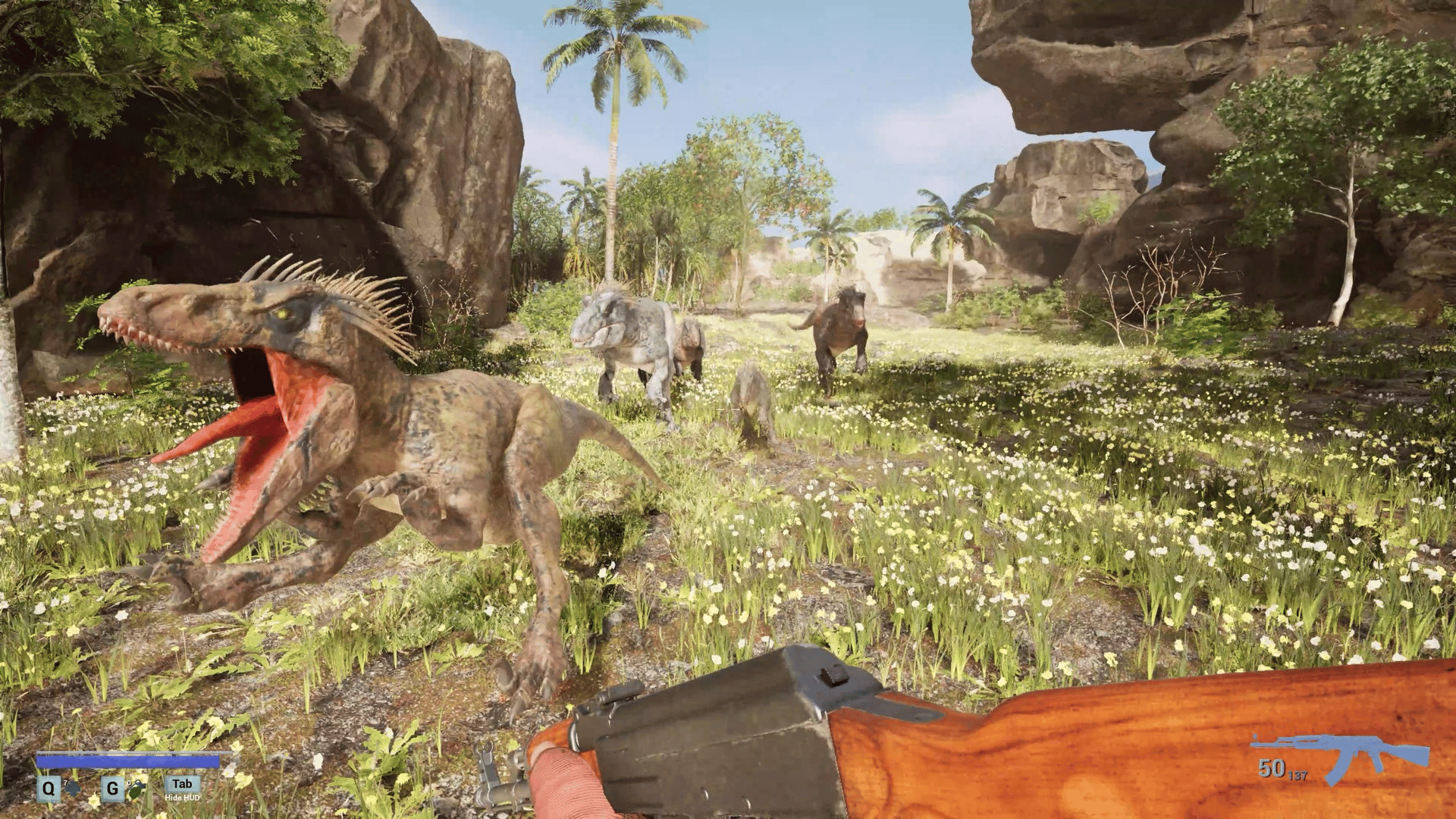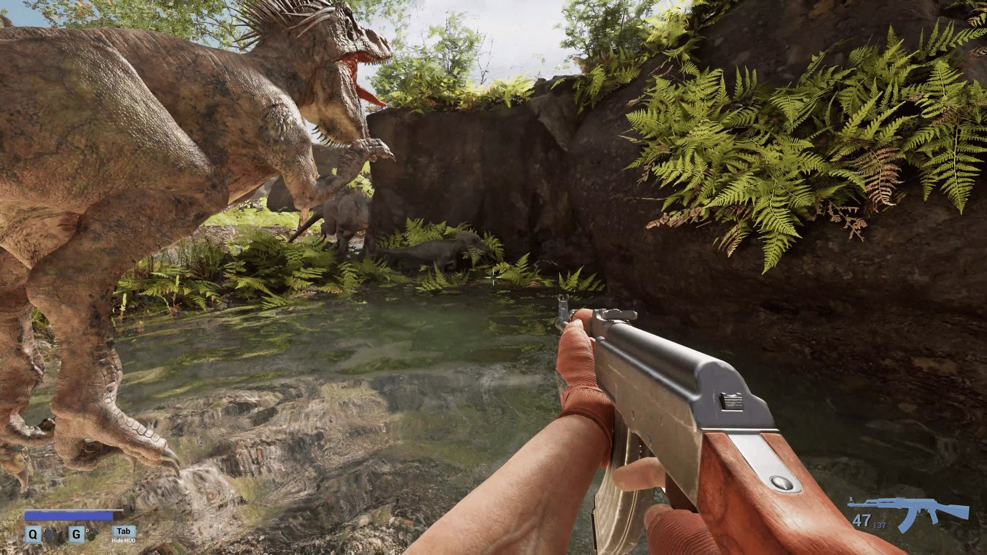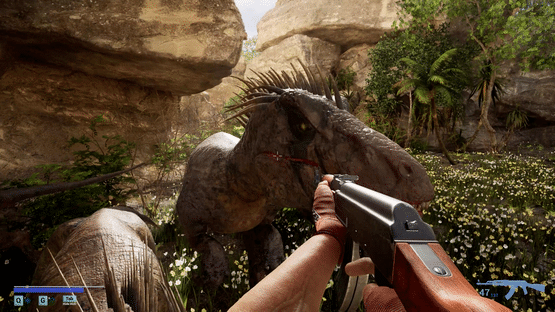 A first-person survival horror set in a post-apocalyptic linear world with ultra-realistic, 3D-scanned environments varying from cities, indoors, forests, caves where you encounter zombies, dinosaurs, giant mushrooms and massive creatures mutated by toxins released from a meteor crash.