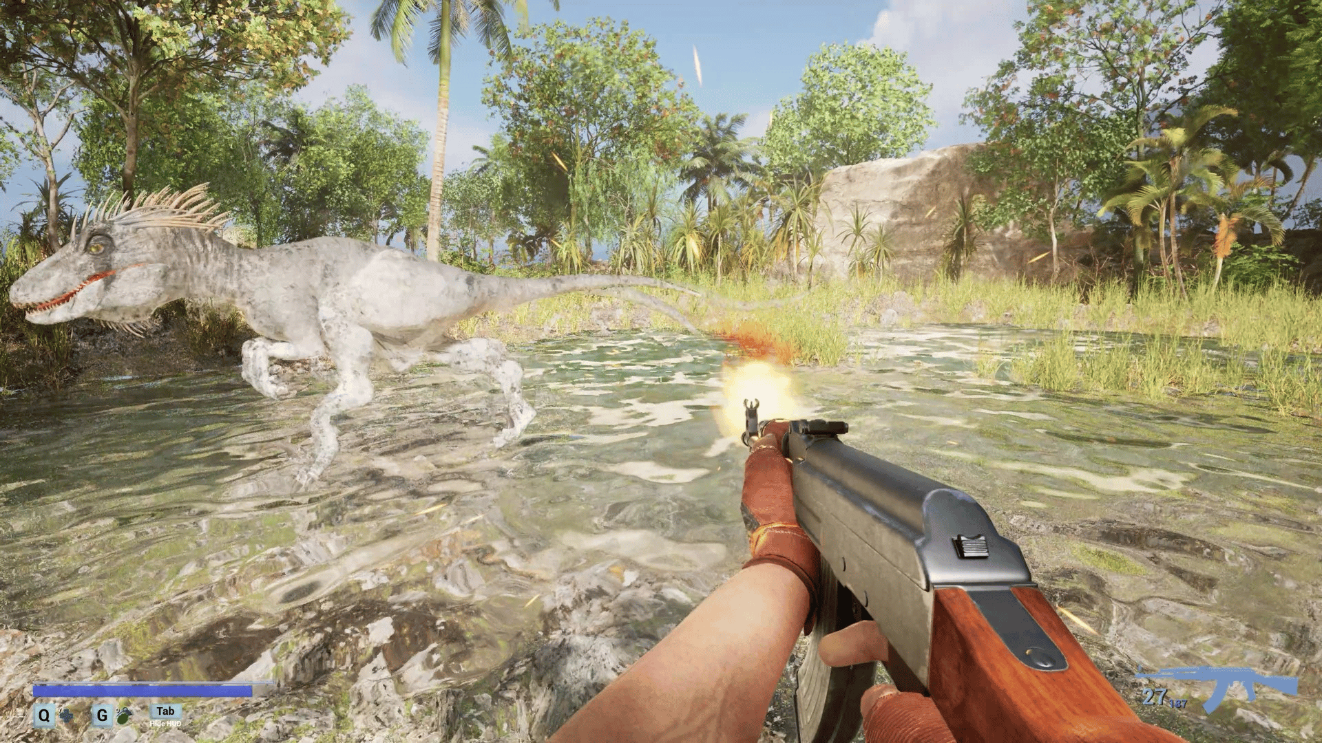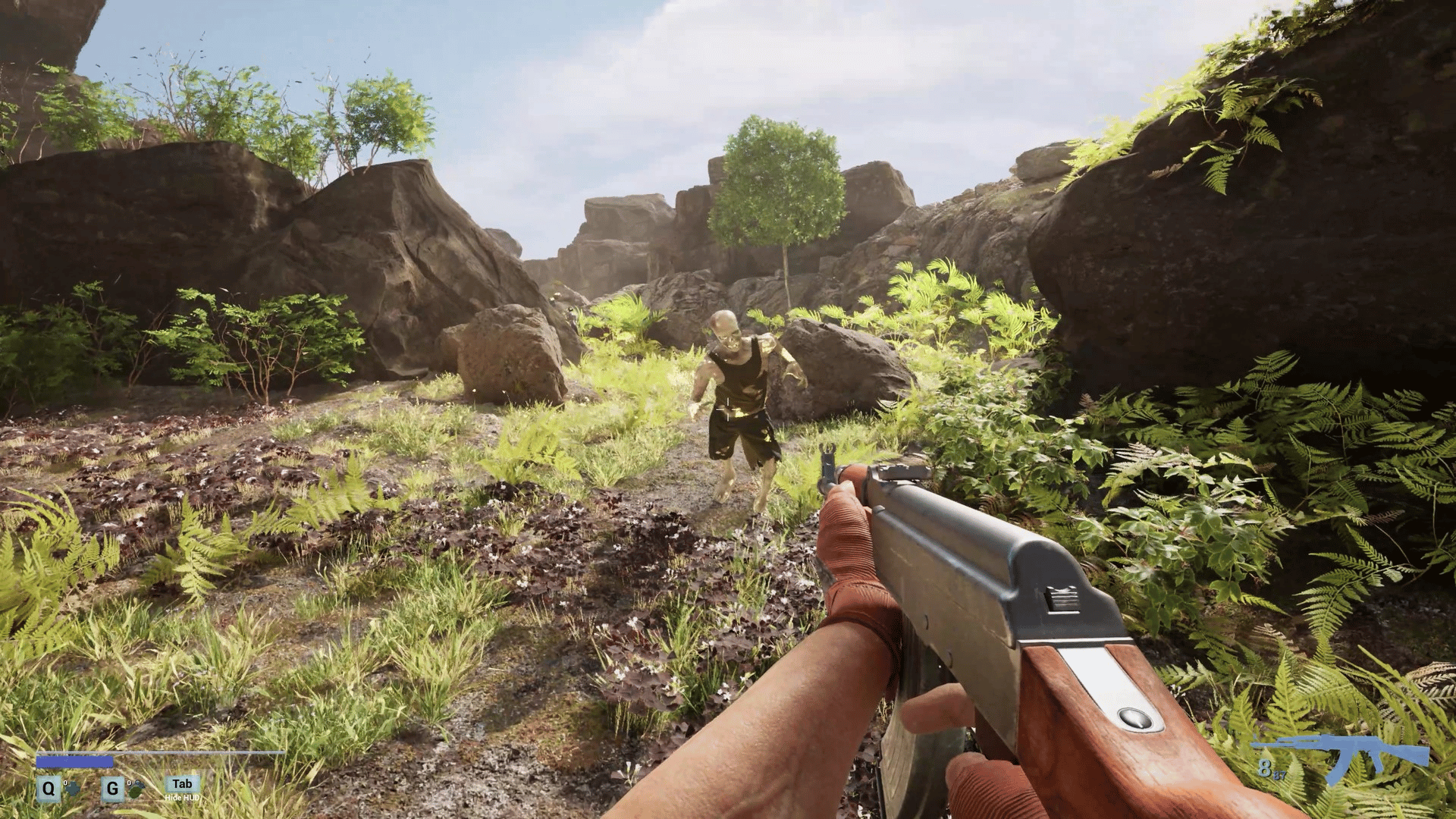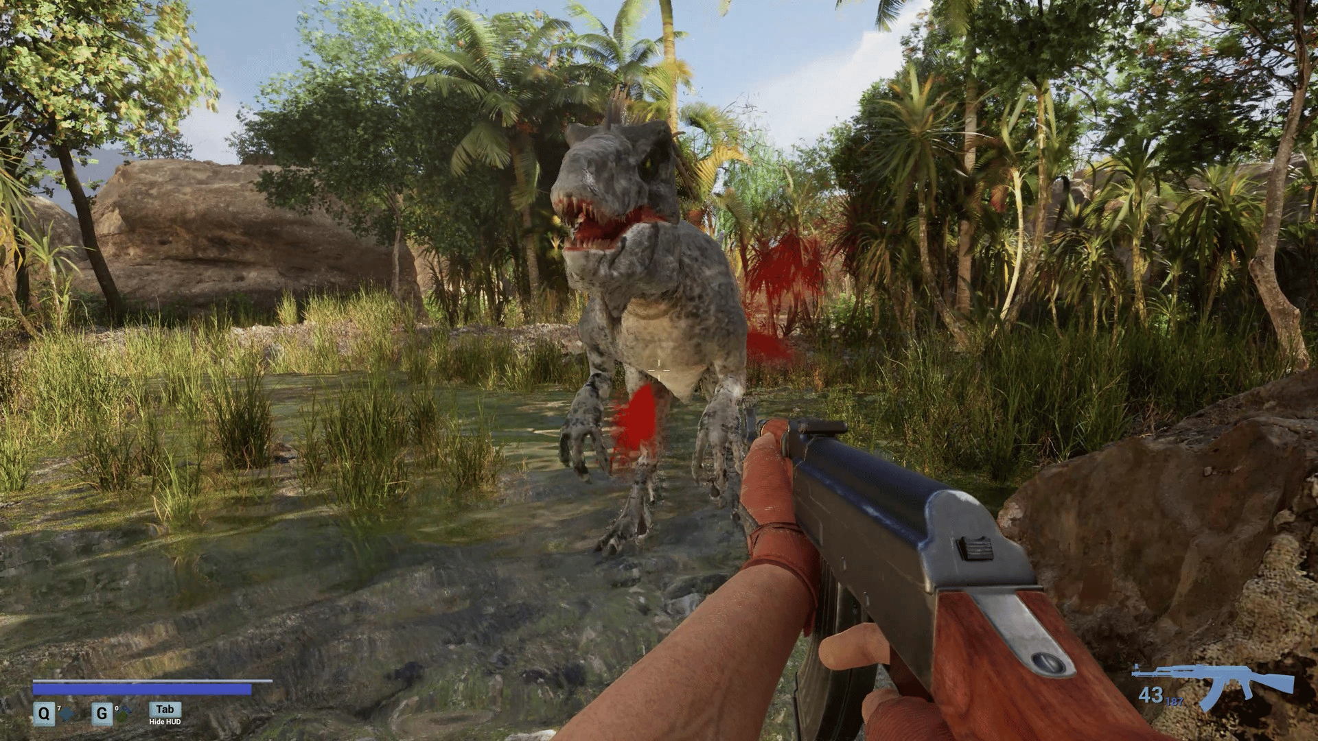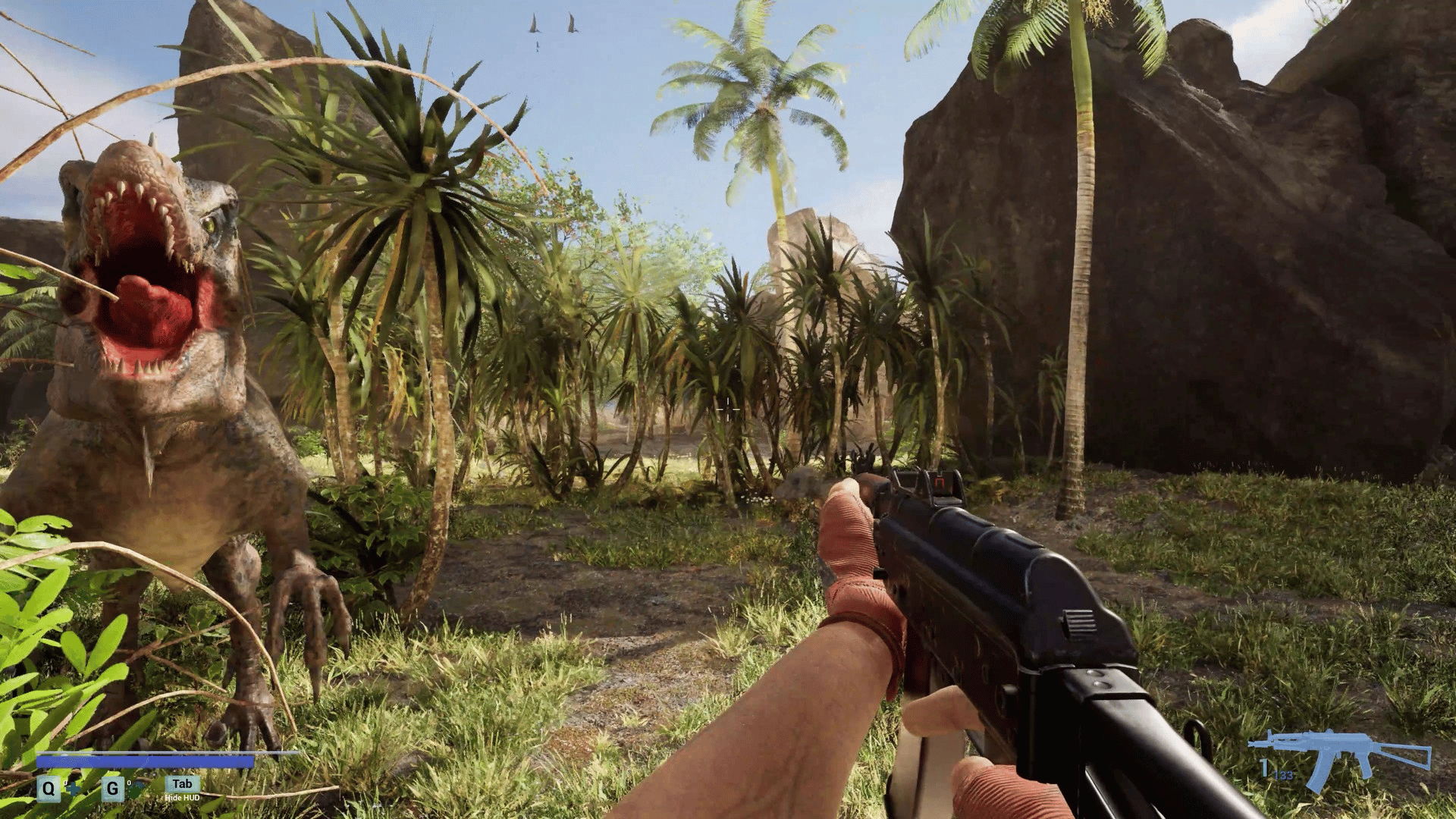 A first-person survival horror set in a post-apocalyptic linear world with ultra-realistic, 3D-scanned environments varying from cities, indoors, forests, caves where you encounter zombies, dinosaurs, giant mushrooms and massive creatures mutated by toxins released from a meteor crash.