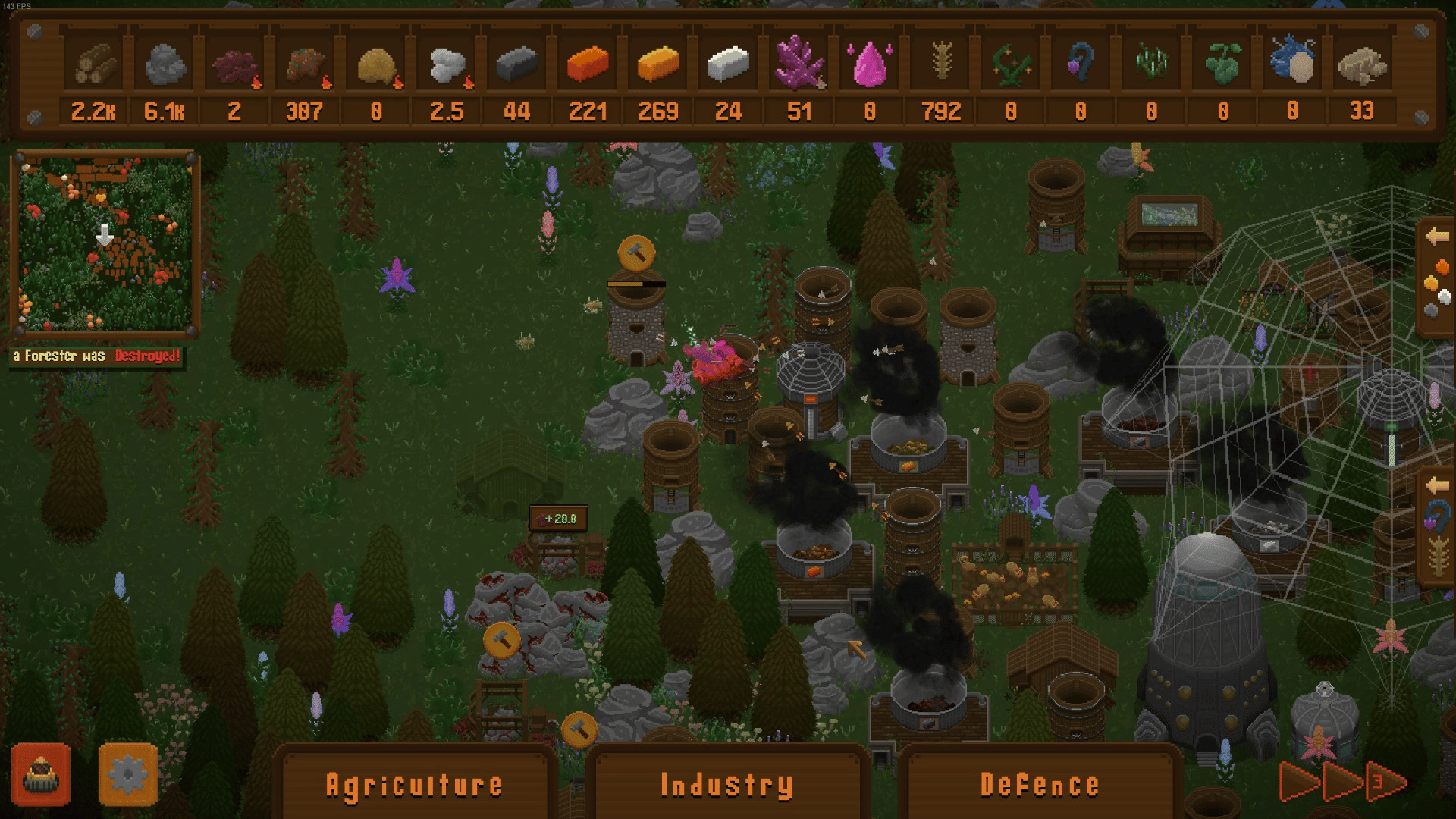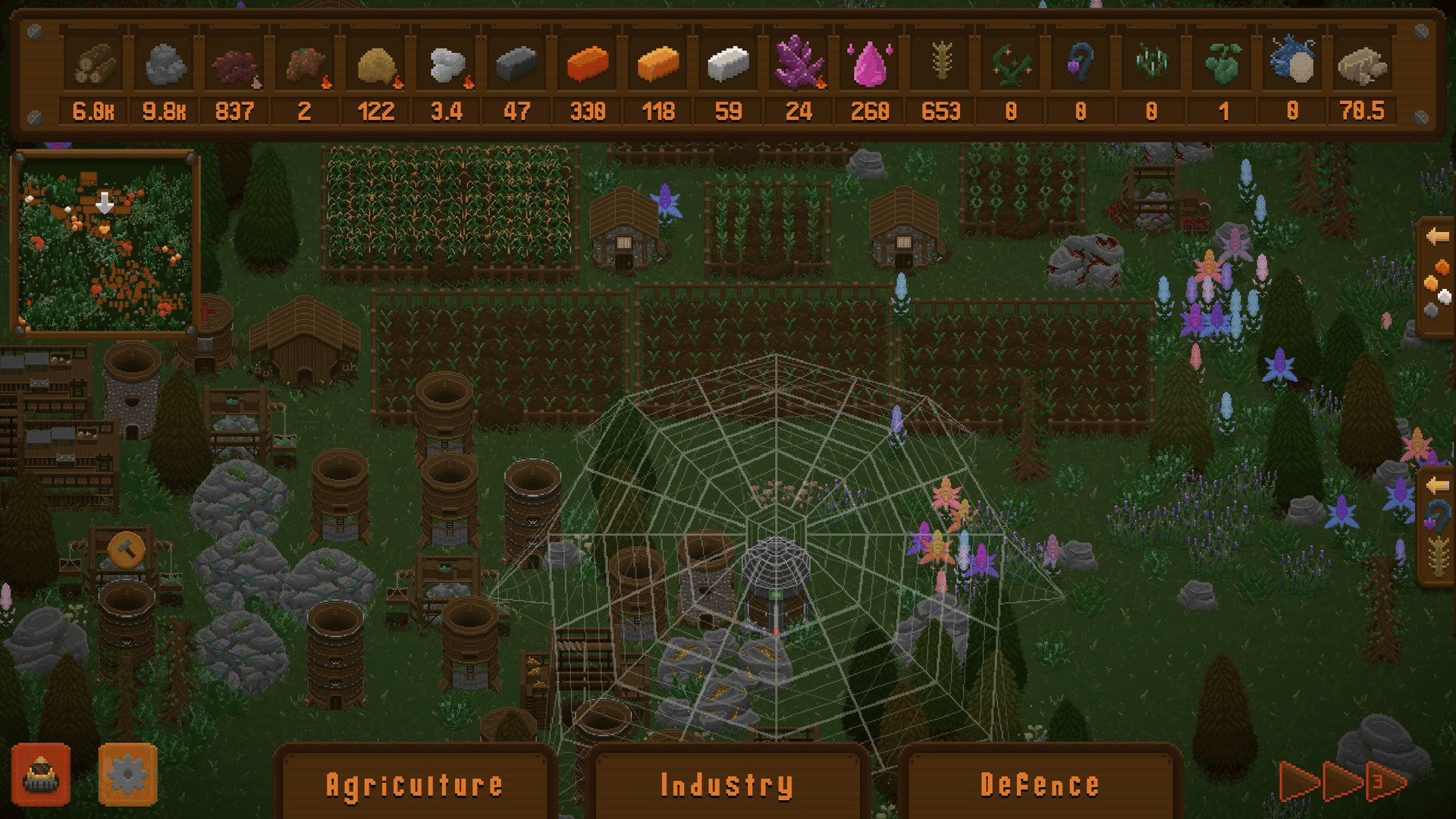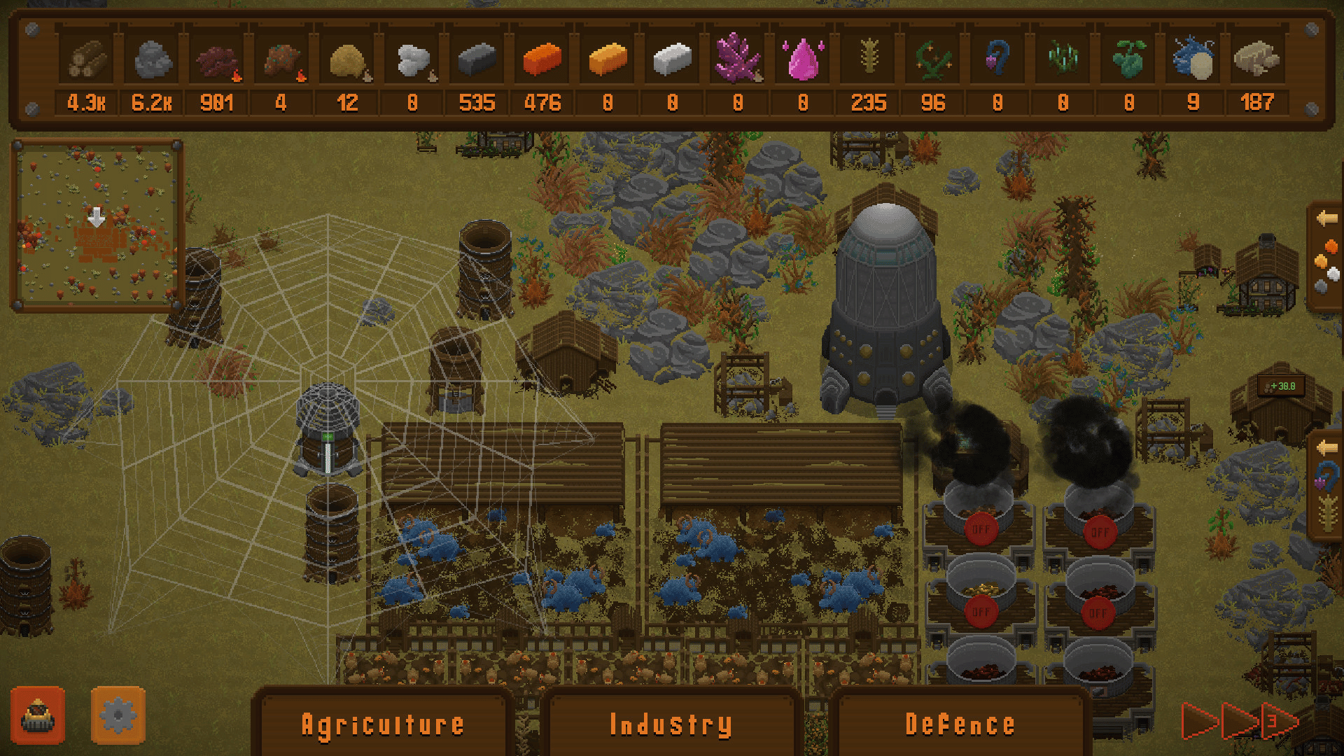 A tower-defence-like colony sim where you must extract resources from the land and produce fuel to escape the planet. Expand across each map researching various structures, creatively avoiding or engaging with local creatures to take their precious crystals. Research, Build, Expand, Extract!