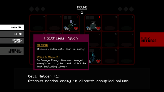 A turn-based auto battler secret society. Draft your grid of allies, arrange them in synergistic formations, equip items to gain power, and survive against a gauntlet of enemy grids. Perform the rites and ascend with a variety of different team builds to unlock new allies and powerups!
