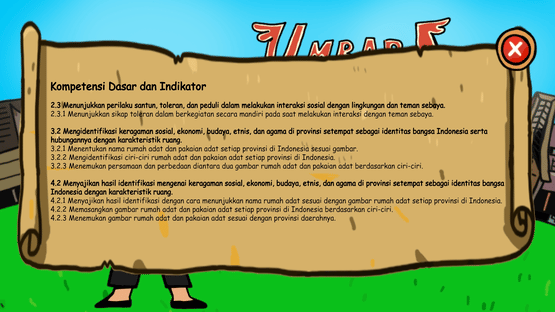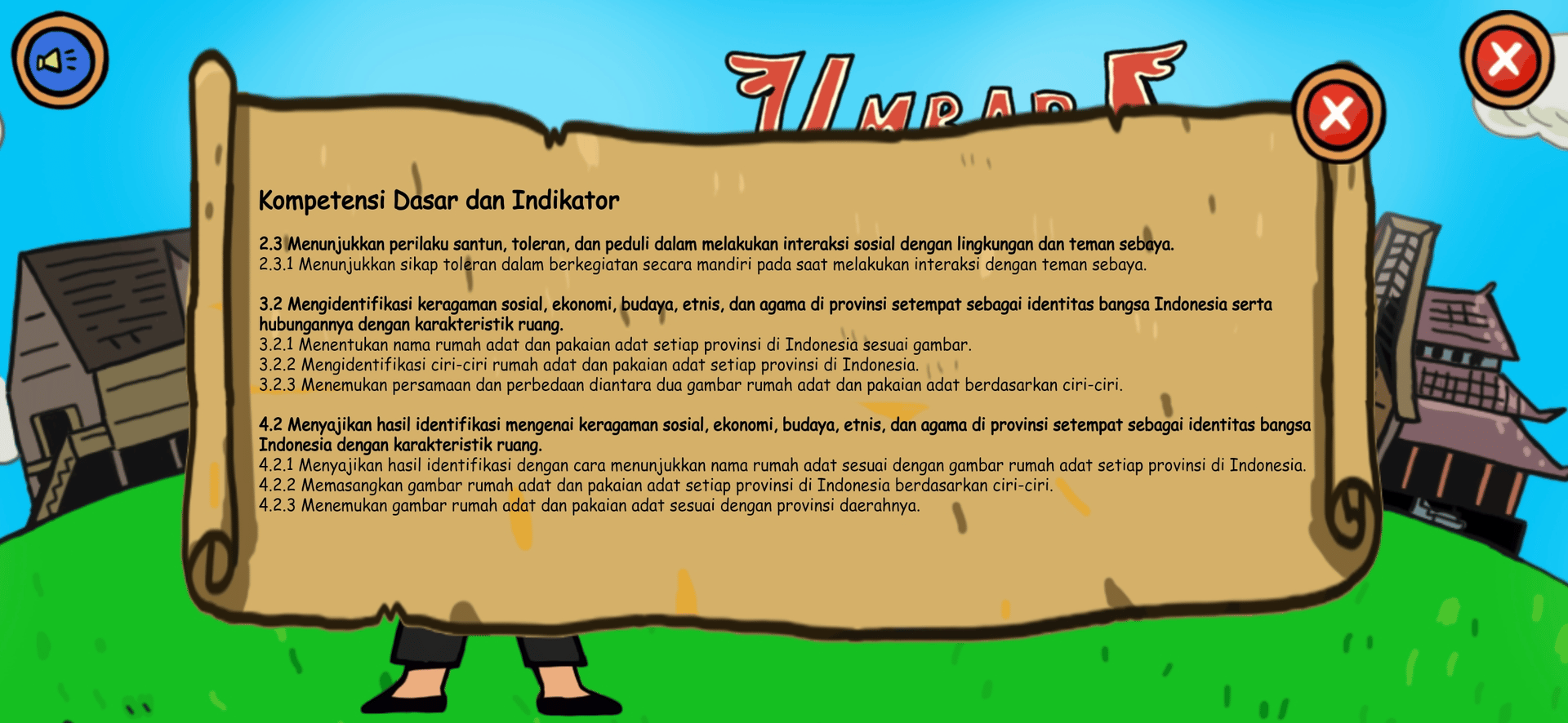 Umbara the Indonesian Child Educational Game is an adventure game for a child named Umbara who wants to complete a mission to learn about cultural diversity, especially traditional houses and traditional clothes by traveling around Indonesia. This game is intended to make fourth grade elementary school students able to learn about Indonesian Cultural Diversity, especially traditional houses and provincial traditional clothes throughout Indonesia in an easy, practical, interesting, and fun way.
