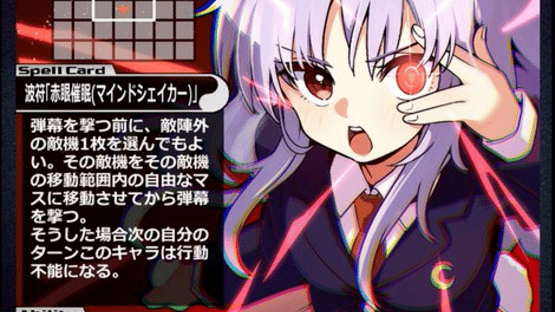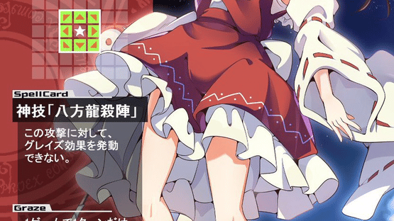 Players place "characters" from their own "deck" on a 6x6 "map." The player "moves" his or her character across the field, shooting barrages of bullets with "spell cards" and avoiding barrages of enemy characters with "graze". Even if your character is destroyed, you can "replenish" your deck of cards to regroup and fight until the enemy's "remaining" units are reduced to zero in this thrilling strategic duel game.