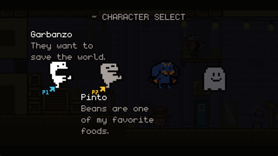 Garbanzo Quest! The crazy bullet-heck platformer where your main weapon is your own spit! Help Garbanzo (and Pinto if you have a buddy) save their Friends from the evil Billi' Bones and his wacky world full of hand-crafted challenges, secrets, and branching paths!