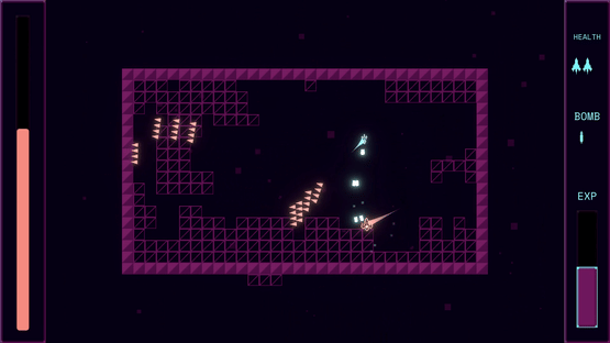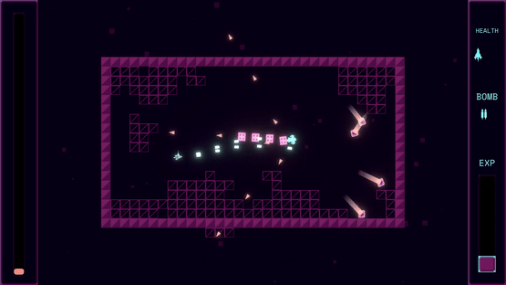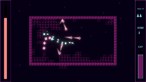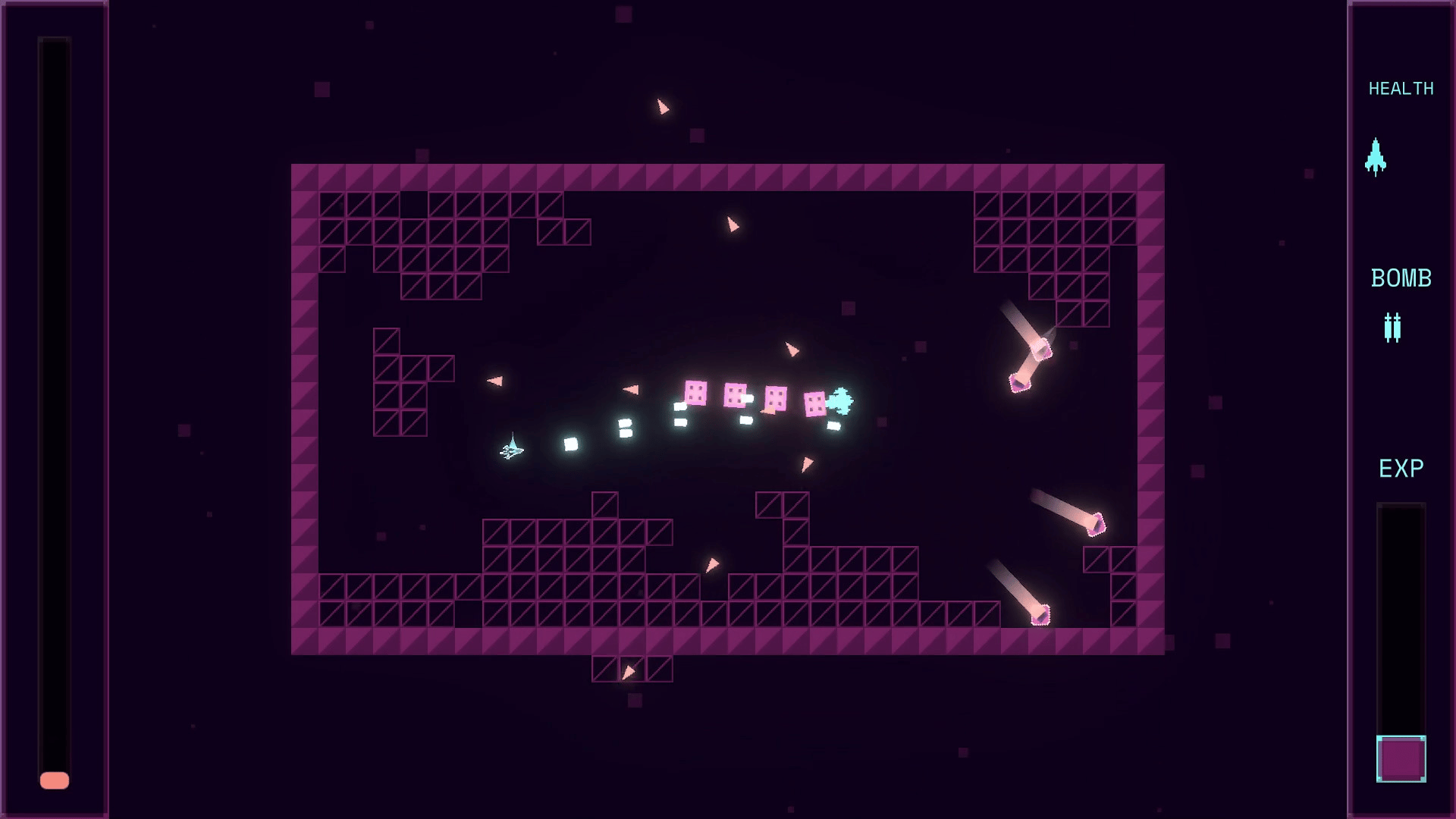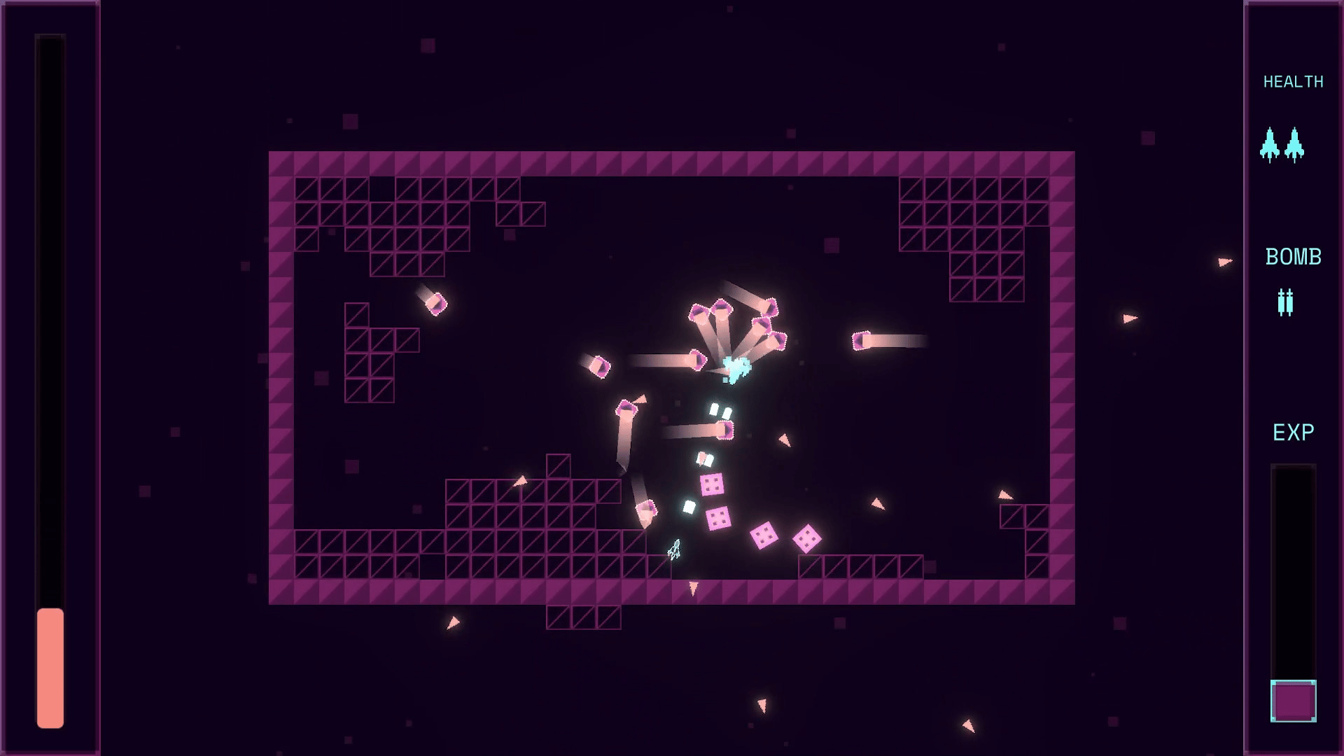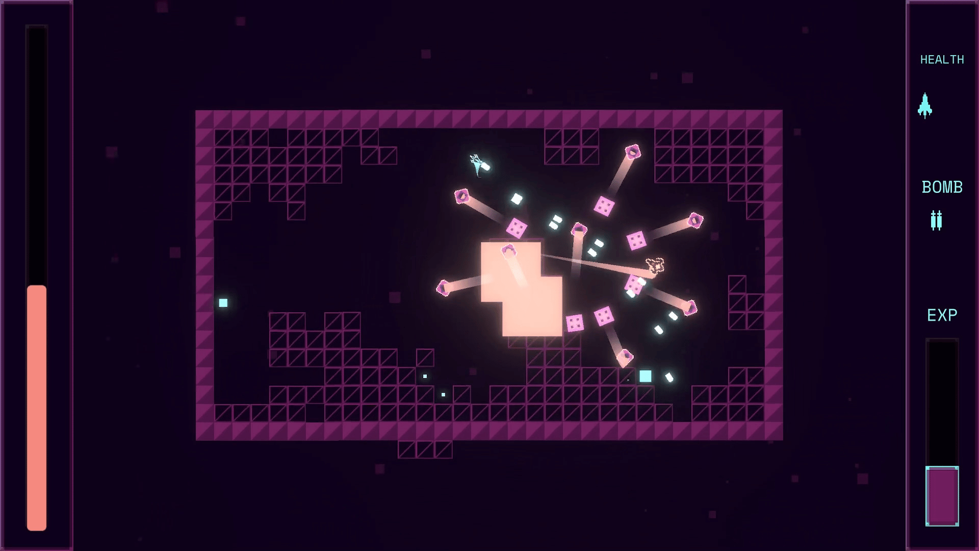 Chaotic boss-rush, bullet-hell-y, twin-stick arena shooter mayhem! Dynamically changing arena forces you to be vigilant: Watch the bullets, watch the walls!