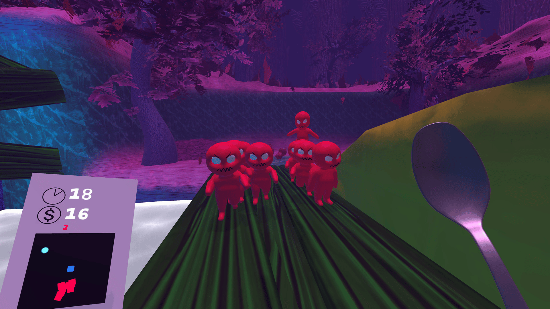 Milksoup is an FPS tower defense about a bunch of nerds trying to steal your cereal. Movement is key as you strafe through the surreal environments, hitting enemies with your silver spoon.