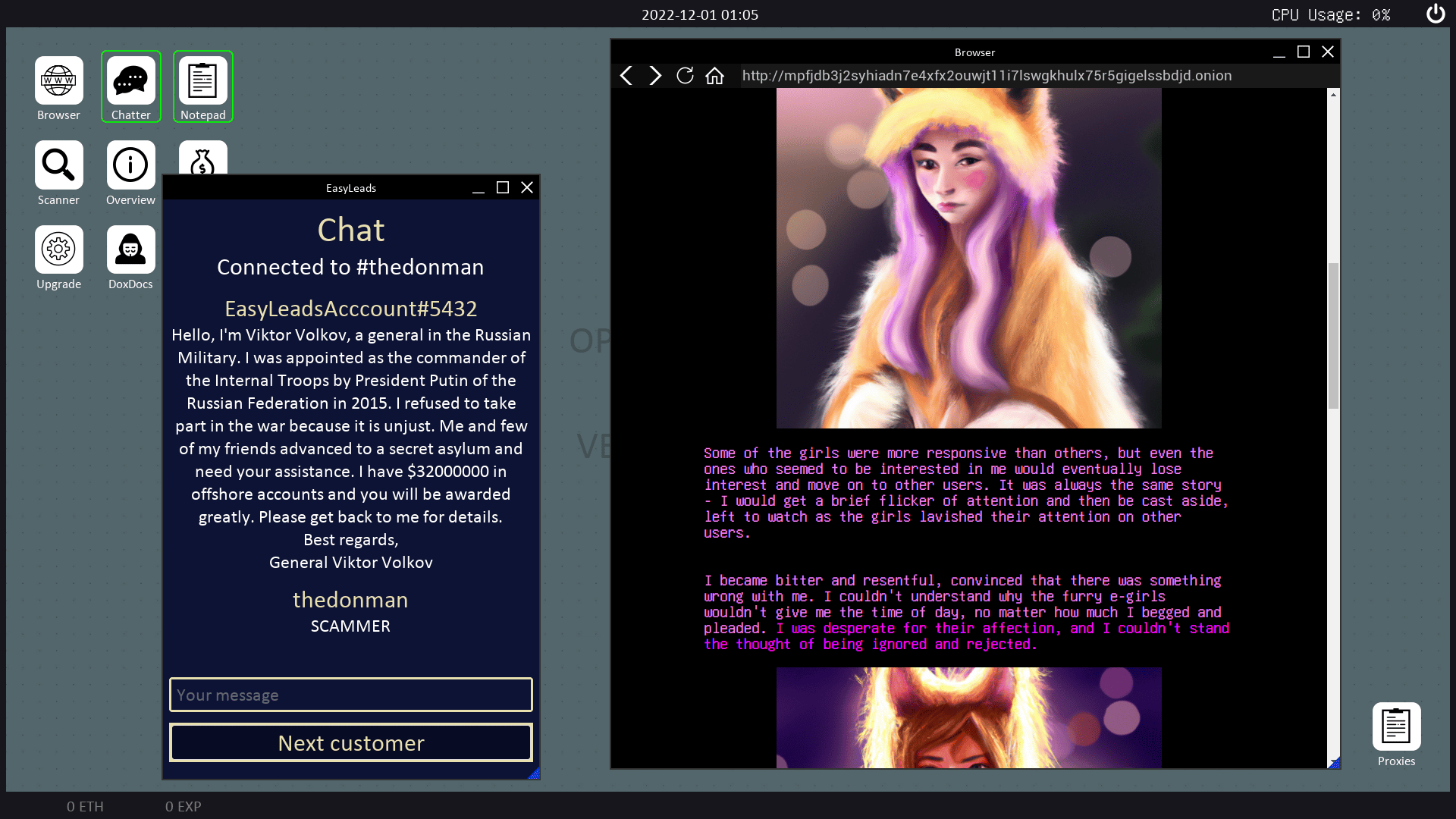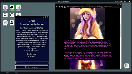 An infamous cybercriminal and owner of a luxurious underground marketplace tries to reclaim his position in the distrustful society of blackhat hackers and druglords. You must utilize your hacking and intelligence gathering skills in a race with your worsening mental state and sudden hallucinations.