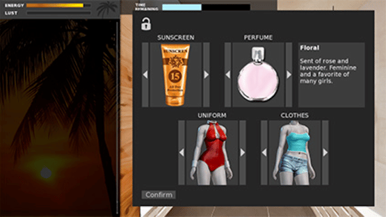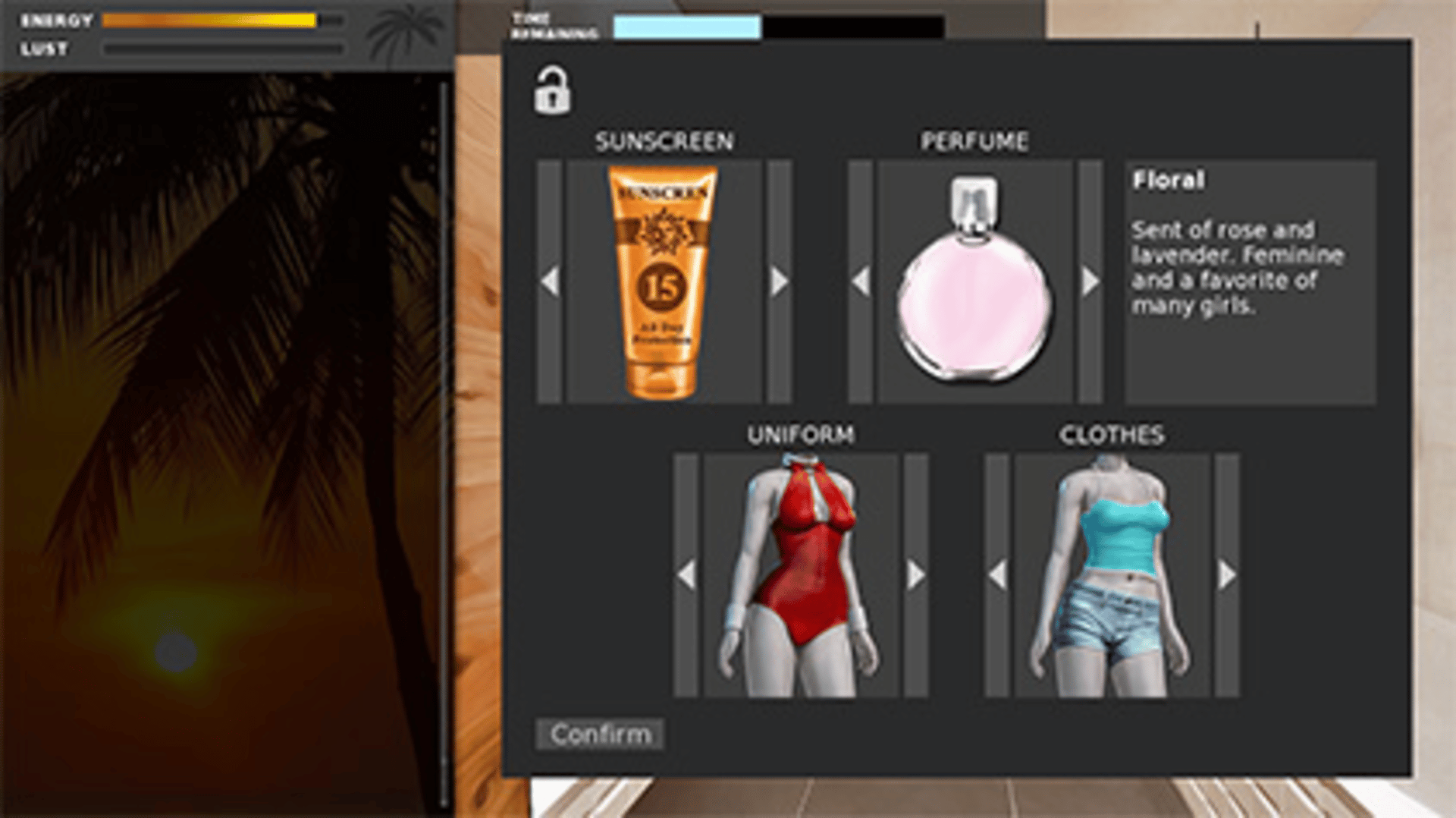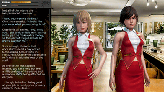 Interns of Ecstasy Island is planned to be an erotic, gender-bender life-sim game. The game is story-focused and text-heavy, presented in a hybrid visual novel format. However, unlike a traditional visual novel that only branches at occasional player choices, Interns has a “life simulation” at its core. Game events are modular, played semi-randomly based on the player character’s job assignments and how they choose to spend their free time at the resort. With events and choices having an effect on the character’s stats, the hope is to provide an interesting and somewhat different experience each time one plays.