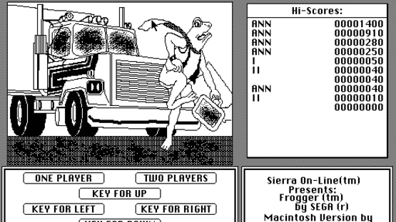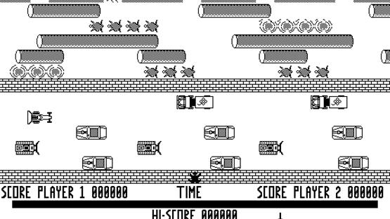 Your task in this arcade game is to guide a frog across a treacherous road and river, and to safety at the top of the screen. Both these sections are fraught with a variety of hazards, each of which will kill the frog and cost you a life if contact is made.