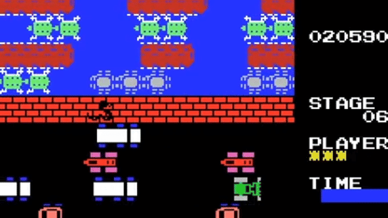 Your task in this arcade game is to guide a frog across a treacherous road and river, and to safety at the top of the screen. Both these sections are fraught with a variety of hazards, each of which will kill the frog and cost you a life if contact is made. The road is full of cars and trucks, at variable speeds. The river water itself is fatal, as are the snakes which hover within on later levels. Frogger must use the arrangement of logs, turtles (which are only there for a short time) and alligators (but stay away from their faces), and then jump into one of the open home-cells, ideally one containing a fly for extra points. Once all holes have been filled, you move onto the next, harder, level.