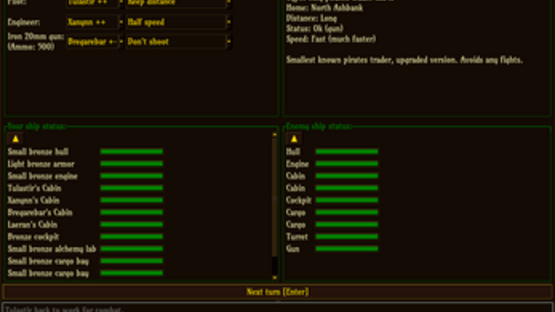 Steam Sky is an open source roguelike with a steampunk setting. You are a commander of a flying ship, as leader you will be traveling across floating bases, engaging in combat, trading goods etc. The game is more strategy based than tactical like most of roguelikes. There is no mandatory ending to this game, you may freely play until your character die. The game is currently in a development, but is in a playable state.