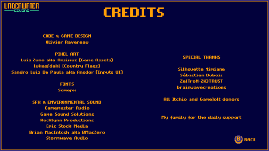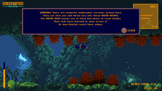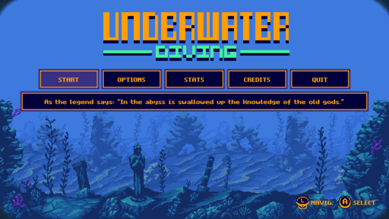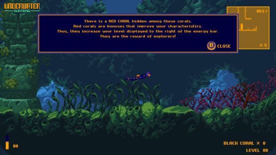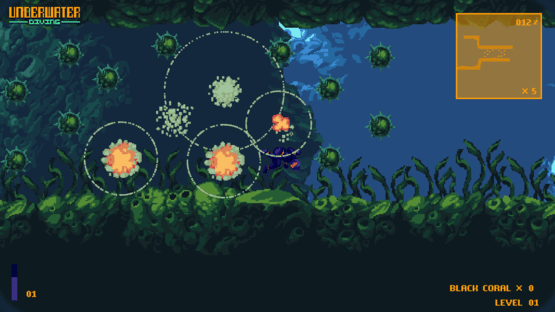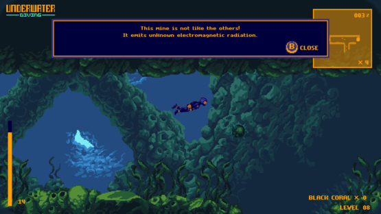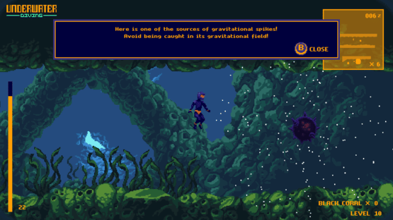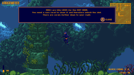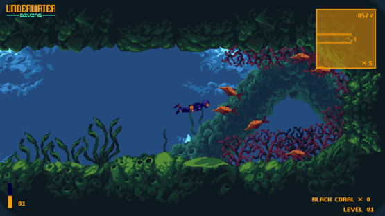 You are an underwater diver surrounded by aggressive fish and mines. Collect the black corals to clean the idols. USP: The diver's energy represents both his life and his stamina, but also his oxygen.