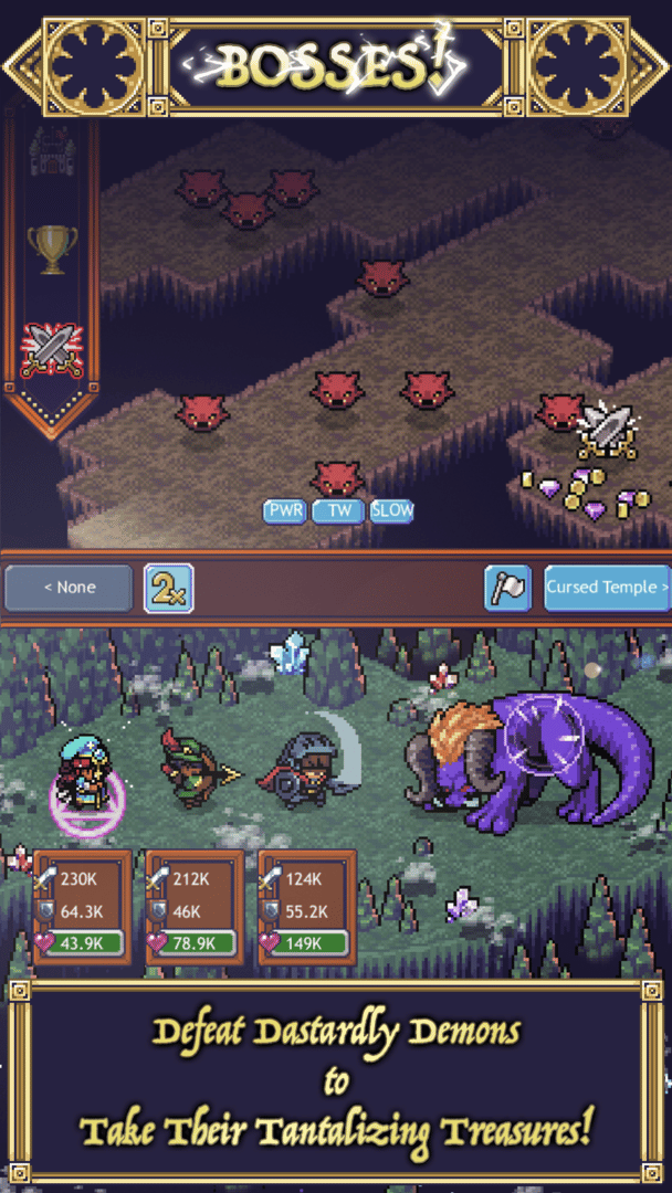 Lead a party of Cave Heroes to explore dungeons, battle monsters and defeat tough archdemons. Build your village, collect loot, rescue pets and much more in this idle RPG.