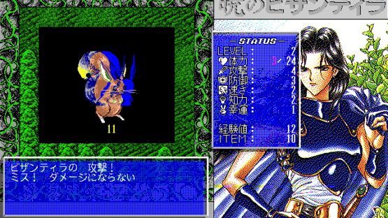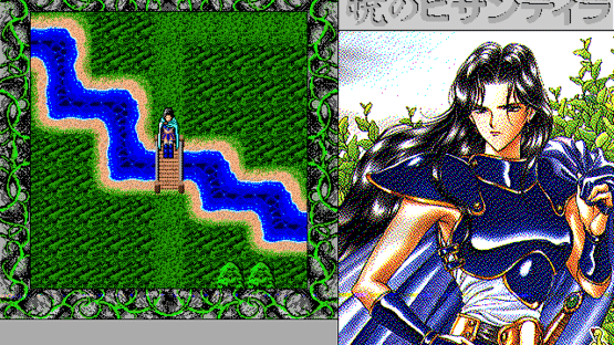 In a world with two moons, humans peacefully co-exist with various species of intelligent animals, called "mebu". But something has destroyed the balance in that world, and animals have started to attack humans. A female warrior named Bizantira, accompanied by the yellow bird Diel, decides to find out the reason behind these occurrences and to discover the truth about humans and mebu. The game is a very basic Japanese-style RPG, with minimal story development and simple gameplay mechanics. The player controls Bizantira as she wanders around the top-down world map, exploring the world and visiting towns. There is no navigation in the towns; locations (such as weapons shop, inn, etc.) are selected through a menu. The battles are random, turn-based, and are viewed from first-person perspective. The game's story is based on a fantasy novel of the same name by Hiroe Suga.