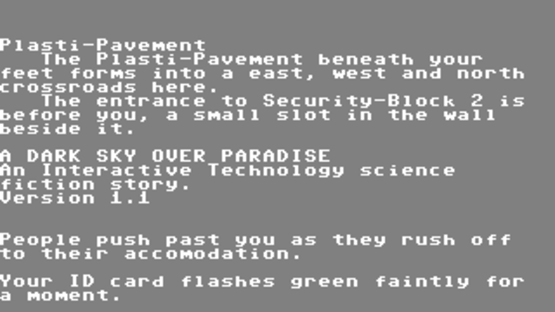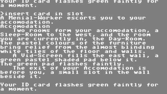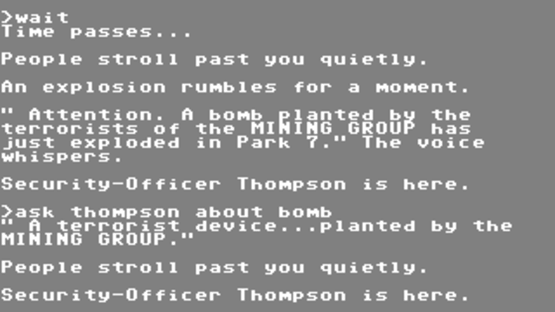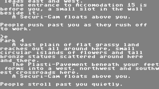 In the future, Earth's resources have been stretched to their limit from it's ever expanding population and the future of mankind looks very bleak and hard. The governing body, FourNations have devised a plan to colonise Mars to send the overspill of man to ease the problems on Earth. The building starts well but the cost spirals out of control sending Earth into a deep recession. Years later the project is still proceeding but very slowly and you have been sent to a MoonBase for some unknown instructions that could be to do with the launch of a rocket and keep the colonisation project moving. As you are summoned to various meetings a bomb explodes and you find out that it from a terrorist group called the Mining Group who are trying to prevent the launch of the rocket. In this text adventure you have to explore various locations described by text, to find out what your mission is, find out more about the terrorist group and what their reasons are. You type in commands with the keyboard to interact with your locations, objects and people.