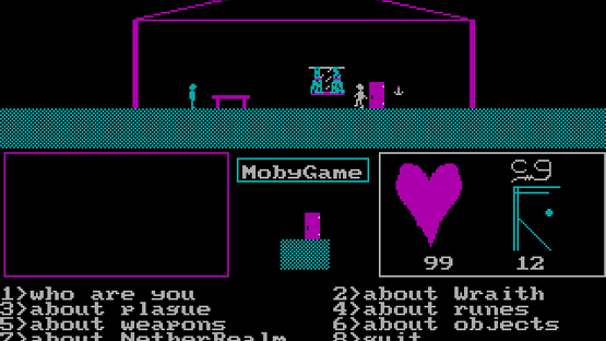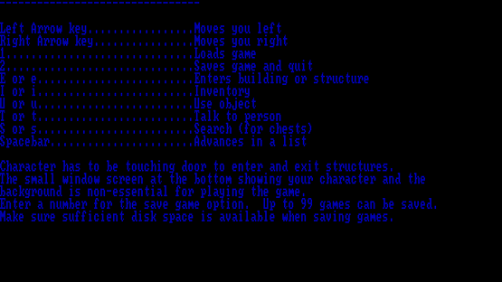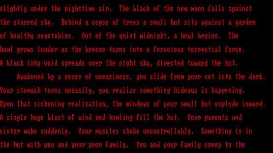 In Dismal Passages you are cast in the role of a youth who lives in a land called 'Drelg Artavia', which is being harrowed by evil Wraiths from the NetherRealm. In the grisly text introduction, your home is invaded during the night by three wraiths who attack and kill both your parents and your sister, but before they can kill you too, a grey wolf-like character interrupts the assailants and manages to drive them off, while itself is mortally wounded. Using it's last breath, the wolf asks you to get revenge on the head wraith called 'Vaargerold' / 'Vaalgerald' for the death of himself and your family, and you set out next morning to achieve this.