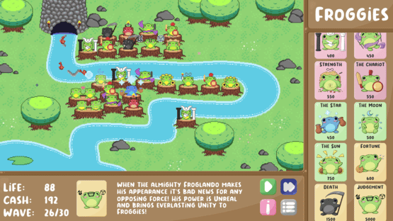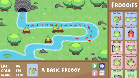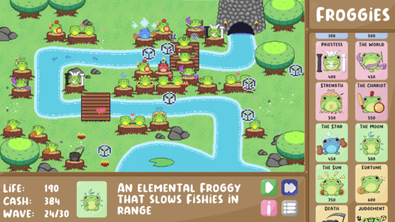 Ninja Froggies is a tower defense game in which you help the little Froggies to defend their pond against the Fishies that try to evade it and snacc their Tadpoles! With a variety of brave warriors you can build up a strong army of Froggies to fight the waves of enemies approaching. Each Froggy has their own unique power or effect that either serve to fight head on or help others by increasing certain stats.