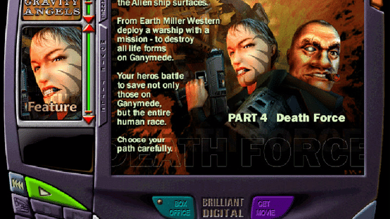 This is the fourth and final chapter in Brilliant Digital Entertainment's Gravity Angels series of Multipath Movies. Each one of these interactive movies uses a proprietary video engine that renders animated scenes in real-time. In the course of the movie, players can make a number of 'decisions' that will lead the story down different plot branches. After the events of the first, second and third chapters, the enigmatic alien ship breaches the surface of Ganymede. Our heroes decide to pay another visit and stumble upon the ship's control room, where they will make a startling discovery. Time is running out for the team as they find out that Miller Western, the most powerful company in human history, knew all along what was going on on Ganymede. Company reinforcements arrive in strength and they have no intention of taking prisoners. The only thing left to do for Ty, Felice, Jazz, Reece, Bennett and the others, is to start making preparations for their last stand against this Death Force...