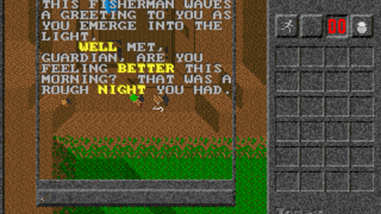 Joyous Rebel is an RPG inspired by the Ultima series of games. Initially a shareware title, it was later made available free of charge. It is a reworked version of a smaller game known as Joyous Rebellions of Jive Culture. As a guardian it is your duty to defend the king of light. But you had to travel from you islands on a journey of peace and while you where gone booth the king and you feels that evil draws near. You hurry back to you island to defend the king but an enormous storm slows you down and a lightning almost kills you when it hits your boat a fisherman saves you and let you sleep over the night in his cabin. You are now well rested and must hurry to the caste to save the king of light. The screen is divided into two parts; to the left is the game area where all the action takes place and to the left is your inventory and indicators of what action you are about to execute. In the game you can use four commands: change between attack mode and walk mode, fire ballistic weapon, Do it (climb stairs, open doors, pick up items) and use inventory. The inventory can contain 24 items.