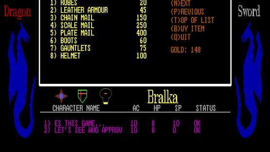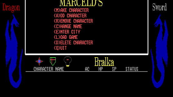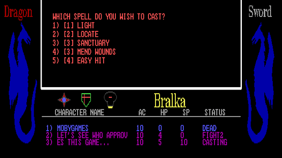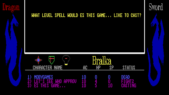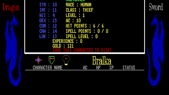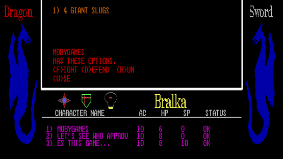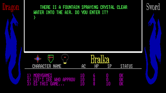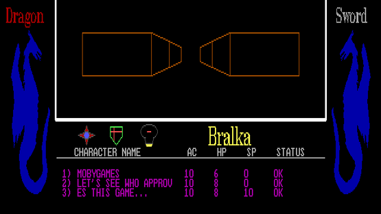 A band of fearless dungeon crawlers must seek out The Dragon Sword and confront the dragon Oijngate. The Dragon Sword is the fabled sword which has the power to defeat a powerful creature like Oijngate. The Dragon Sword is an RPG similar to the Wizardry series of games. You will explore large maps which you view in the first person and fight monsters in turn-based combat. You will create characters by giving them names and choosing their race and class and picking from randomly generated attributes. Then your selected group will dive right into the adventure. Monster encounters pop up unexpectedly so be ready to fight at any time. Your warrior and mêlée class characters can use an array of weapons against foes while magic casters can likewise use an array of magical spells and weapons. Once in a while you will run into a store where you'll be able to use collected gold and items to trade and purchase items of your choosing. The thirty levels that you will battle through will not only present combat but will also try to stump you with puzzles. The puzzles may involve literally asking quizzing questions or may involve requiring you to figure out how to open a door or pass a certain obstacle. The maps will also get easier to get lost in as you move up the level and will get lengthier. Character leveling is also done automatically with attributes distributed amongst your team members once they pass a certain experience level.