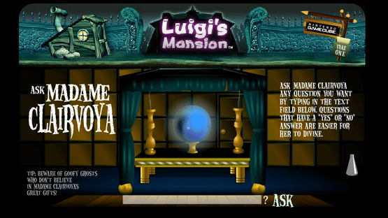 Ask Madame Clairvoya was an activity that was part of the Lab Flash game on the Luigi's Mansion microsite on Nintendo's North American website. The game featured the fortune-teller ghost, Madame Clairvoya in the Fortune-teller's Room.