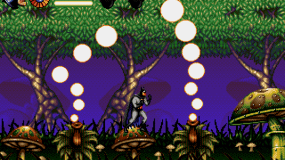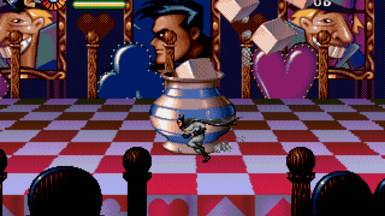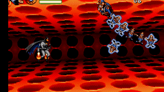 The Mega Drive/Genesis version, developed by Clockwork Tortoise and published by Sega, is a run 'n' gun where both Batman and Robin must stop Mr. Freeze, who plans to freeze Gotham City. In order to keep the duo busy, he also frees the Joker, Two-Face and the Mad Hatter, each one with their own agenda. The Joker celebrates his birthday wreaking havoc in Gotham and stealing diamonds, Two-Face tries to take over the city from above, and Mad Hatter is creating a robot army in his surreal lair. The game can be played by two players simultaneously; one player with Batman, and the other with Robin. Both characters are identical in terms of playability, and both use batarangs, bolas, or shurikens in long-range attacks, while using melee attacks at short range. There are four levels consisting of several stages, mostly of a straight left-to-right traverse to the end where the boss awaits. In some levels the game switches to a side-scrolling shooter, in which the players must control the Batwings. The game is regarded as being extremely difficult to complete, and also known for showcasing some of the most impressive special effects on the Mega Drive/Genesis. It also features a soundtrack by Jesper Kyd. This accounts for the relatively high quality of Kyd's compositions, as well as the fairly simple FM synthesized nature of the game's sound effects.