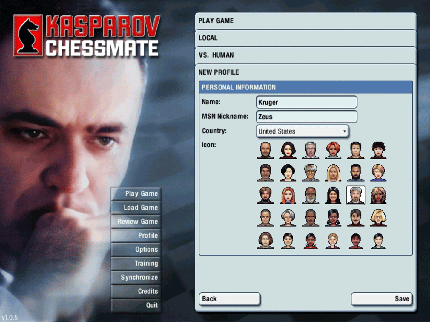 The game is backed by grand chessmaster, Garry Kasparov. Players can create a personal profile using their own name, MSN nickname for online/network play, country and a facial icon. Select a side black or white and game type: "Local" against the computer or other human to either no time limit or specified; "Online" via MSN Game Zone or over a computer network; and "Kasparov Chess Club" of 45 club members in a single "exhibition" game versus any member or "championship" to become Club Champion against all members each has different abilities and ratings ranging from Bronze to Gold with "hints" available during play. Actual play has accessible "history" record of all movement, option to "resign" or "draw" a game. The chessboard is viewable in 2D or 3D and styled as Staunton Black & White, Staunton Rosewood or Modern set with notation in algebraic or figurine. Movement is instant or adjustable by a slide for fast or slower paced game. For a novice unfamiliar with Chess, the "training" (tutorial) segment covers basic rules of play to winning. Strategies for openings and defenses to middle/end games. Useful tips, possible traps and problems. Review a selection of 64 historical games played by the grandmaster himself, Kasparov including famous matches against various top chess players to IBM's supercomputer Deep Blue. Install or synchronize the game using a handheld device: Palm OS 3.5 or PocketPC docked in the cradle from Windows PC CD-ROM.