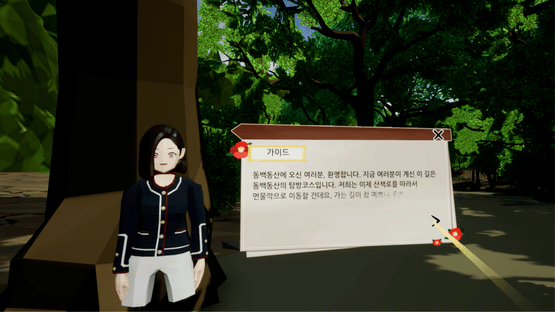 'Camelia VR' is a VR content where you can take a walk in the Jeju Dongbaek dongsan to the Meonmulkkak. You can take a walk there with a virtual guide and listen to the explanation of nature and cultural relics. And you can meet other users and talk with them in the Meonmulkkak.
