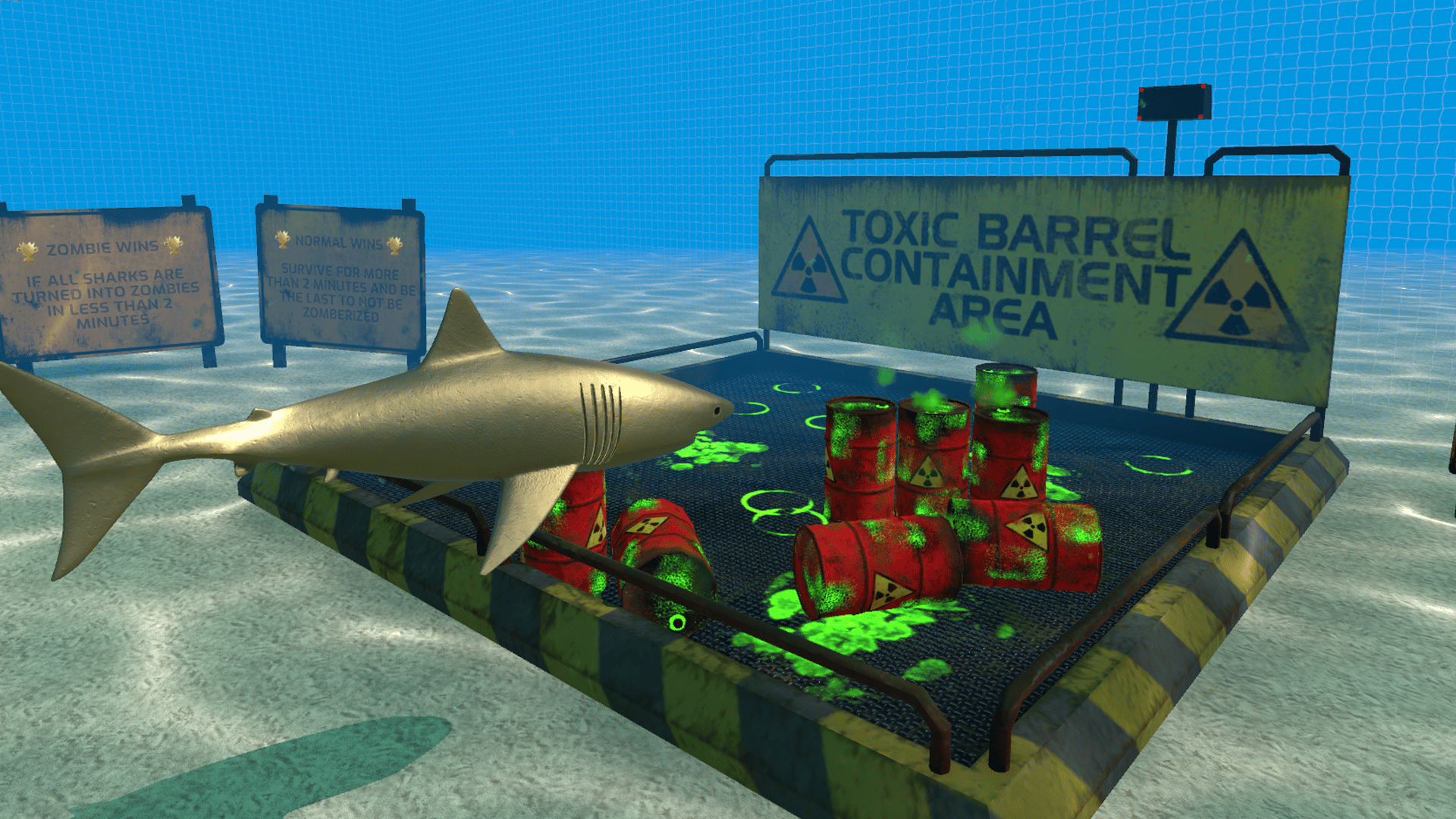 You are the Apex Predator. Swim, bite and attack in VR using a unique locomotion method that only needs the movement of your head and one controller: look where you want to go, pull the trigger to swim, squeeze the grip button to bite. You won't believe how fluid and dynamic the shark motion is. Hunt with groups of up to 10 people online. Eat whatever you can to survive and avoid the zombie sharks: last player standing wins. Escape from other sharks, or outmaneuver the survivors to catch them. Use powerups, hide in caves and shipwrecks, and use cannonballs and mines to evade and chase sharks down.
