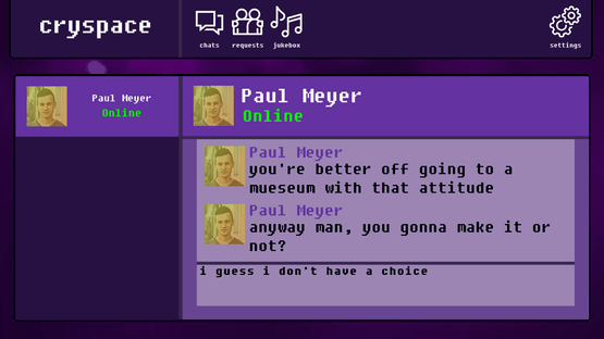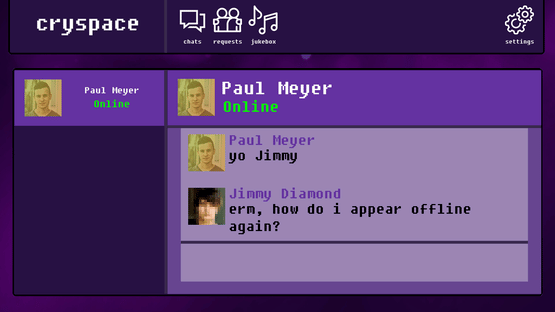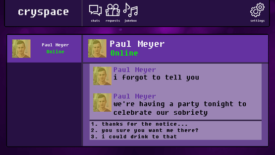 Cryspace is a fresh social media simulator/visual novel with a heavy focus on relationships, dating, and multiple branching paths. Create your profile, connect with friends, and find your way to success, or stumble into despair.