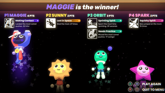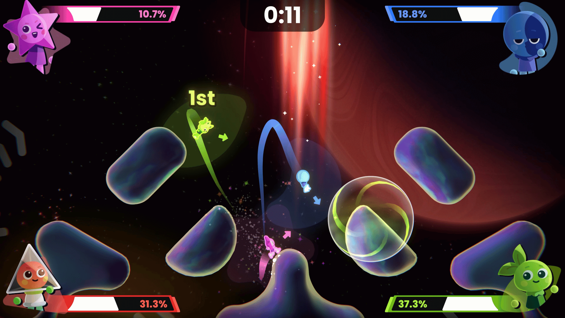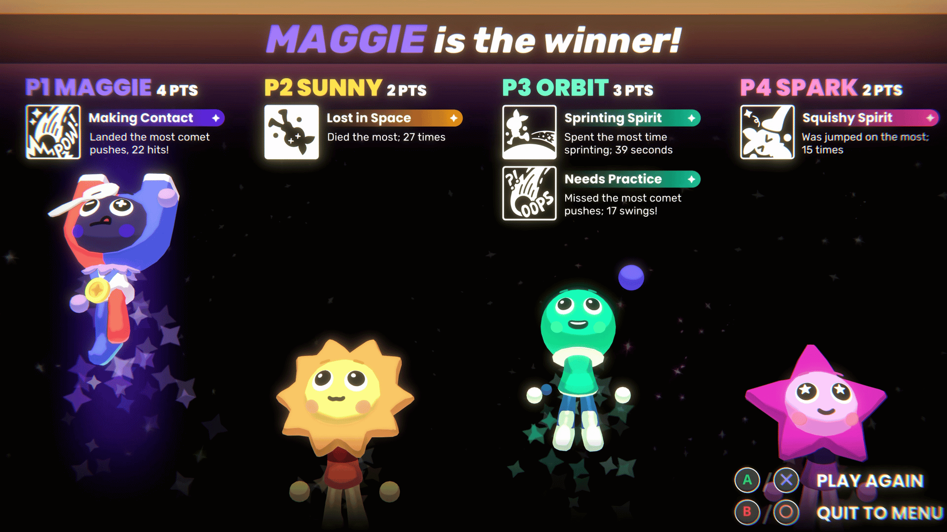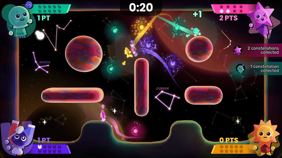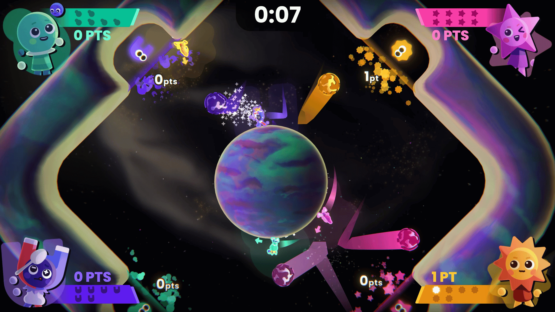 Which Way Up: Galaxy Games is a family friendly party game that gives unique freedom of movement by allowing you to run on walls and ceilings, orbit around planets, or fall across entire levels by manoeuvring through gravity fields. Before The Universe existed, the Space Sprites banded together one-by-one to see a dream come to fruition: the dream of life itself. As The Universe began to take shape, so too did space. But space is unpredictable, and creating life is tiresome work. So, the Sprites took it upon themselves to create a pastime. The Galaxy Games. Each event features its own unique bite-sized challenge where up to 4 players can compete. Eject your friends into space as you race across gravity fields, score a goal with an entire moon, leap across planets to escape a black hole, and capture and hold zodiacal constellations.